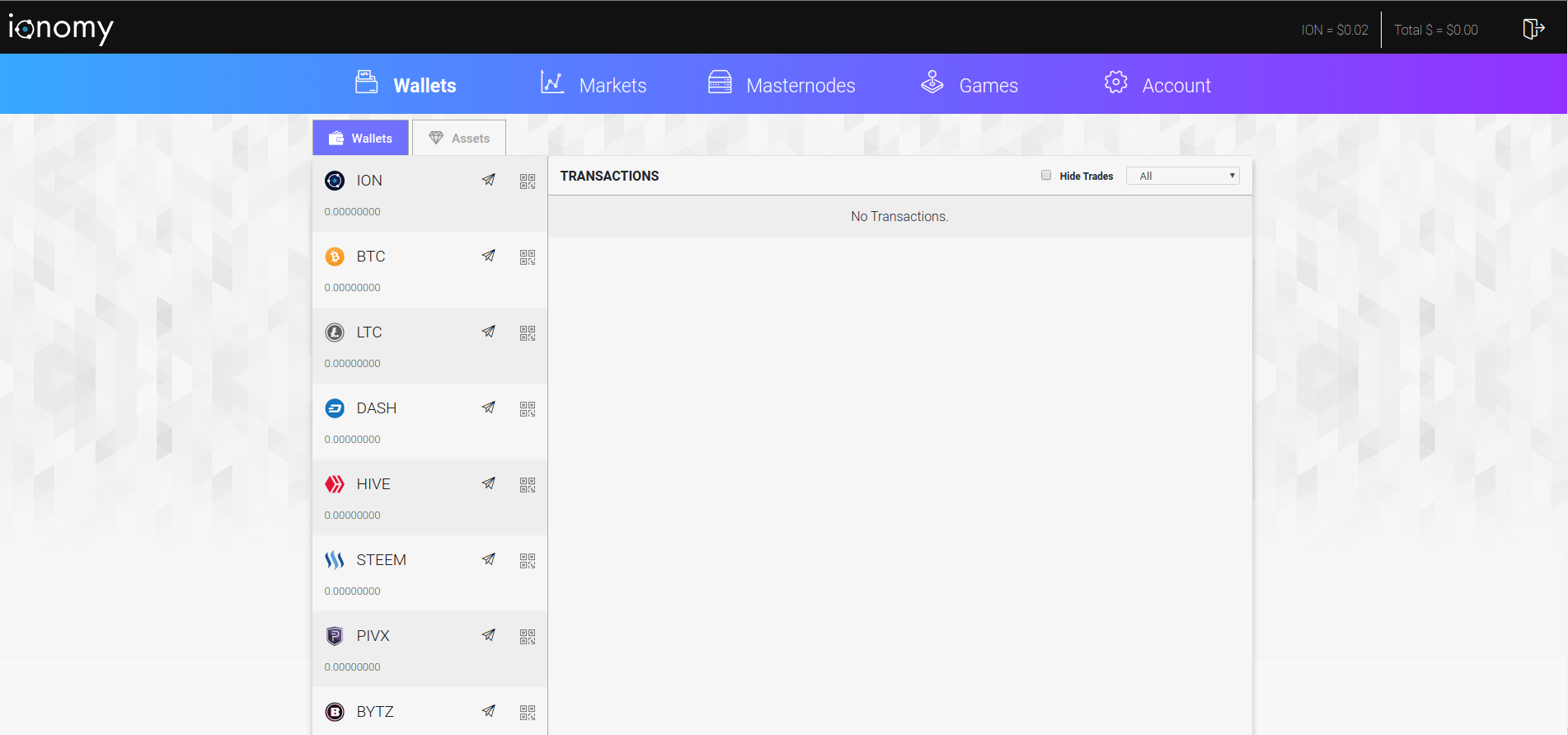 Unter dem Reiter "Wallet" sucht man sich den Coin aus welchen man auf sein Ionomy-Konto einzahlen möchte.