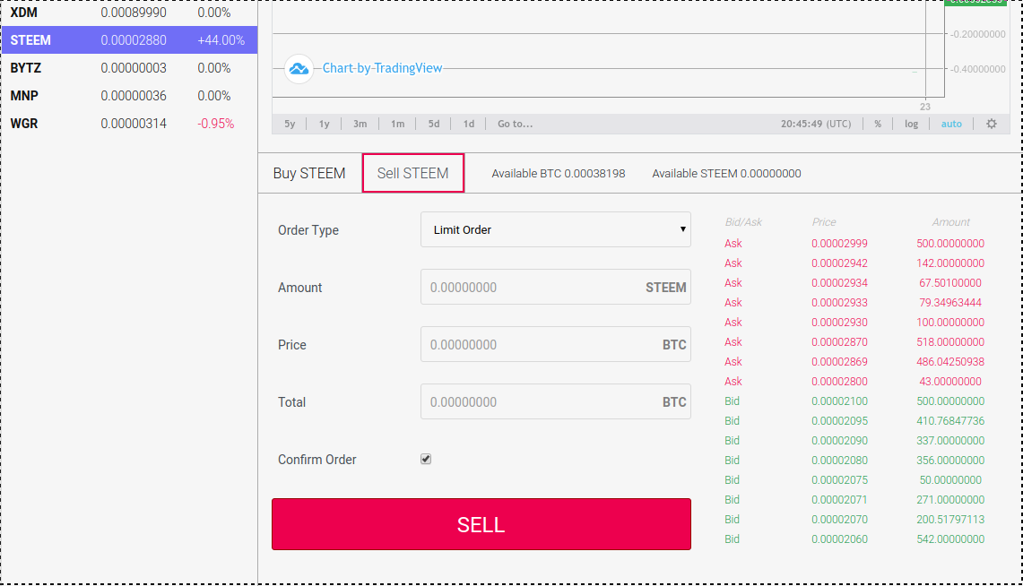 Durch einen Klick auf "Available STEEM", wird der komplette STEEM-Vorat Eures Wallet eingefügt und Ihr müsst euch nur noch für einen realistischen BTC-Preis entscheiden.
