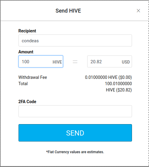 Will man nun seine neu erworbenen Hives's auf seinen HIVE-Account senden, begiebt man sich auf ionomy.com auf sein Wallet und klickt auf das "Papierflugzeug". Dann öffnet sich ein Dialogfenster, in dem der Empfänger und die Anzahl der zuversendenen Coin's eingegeben werden muss.