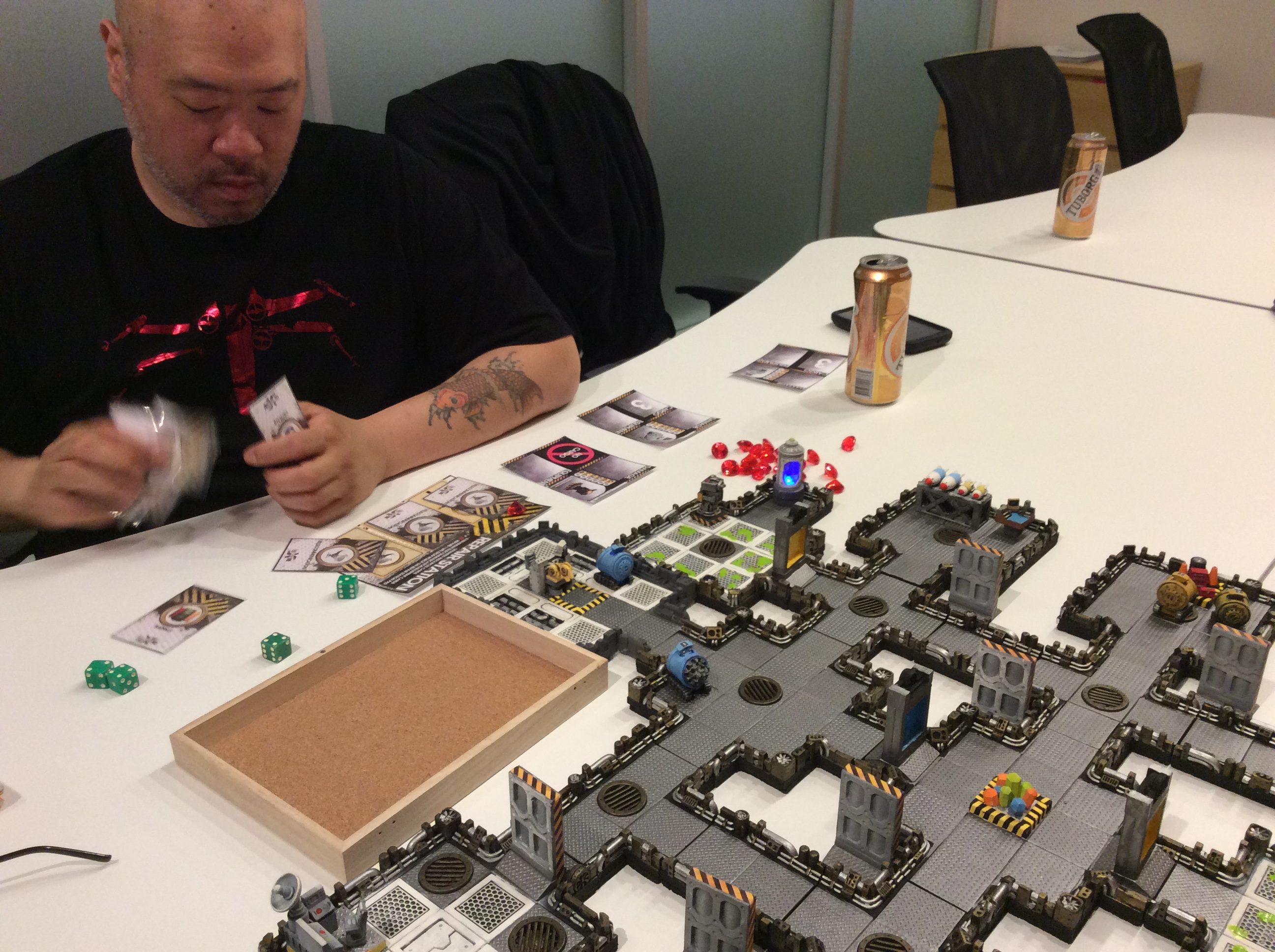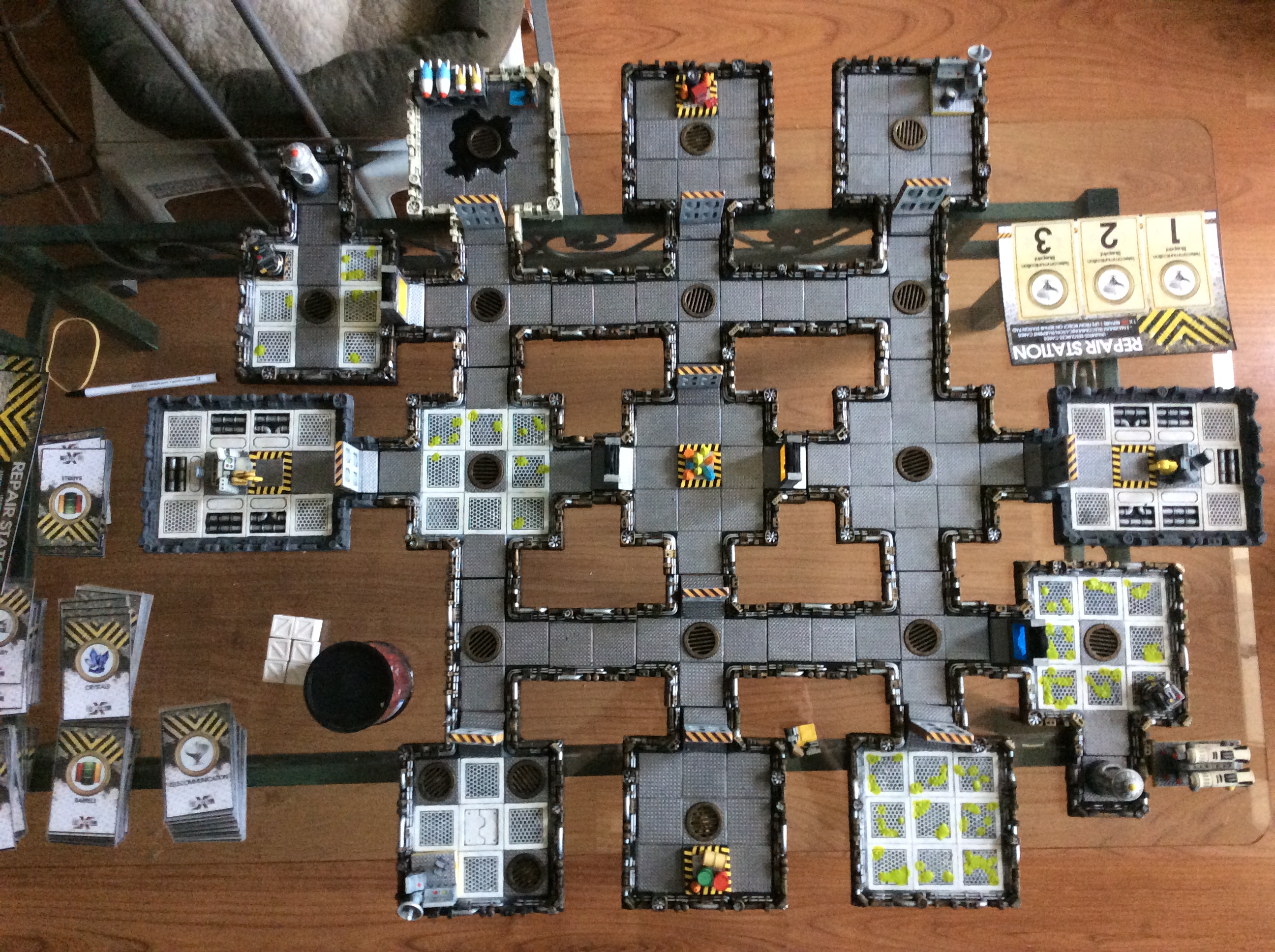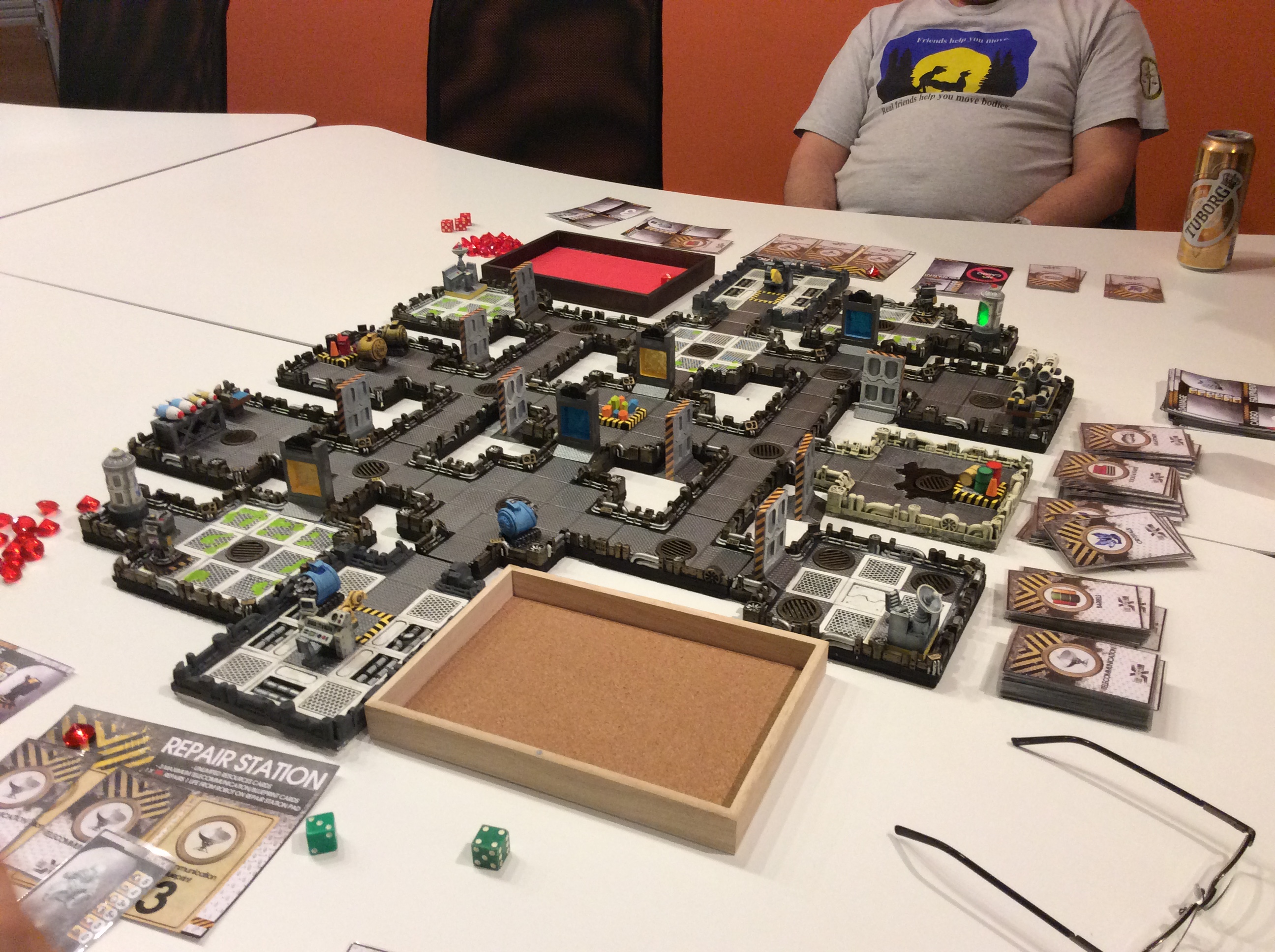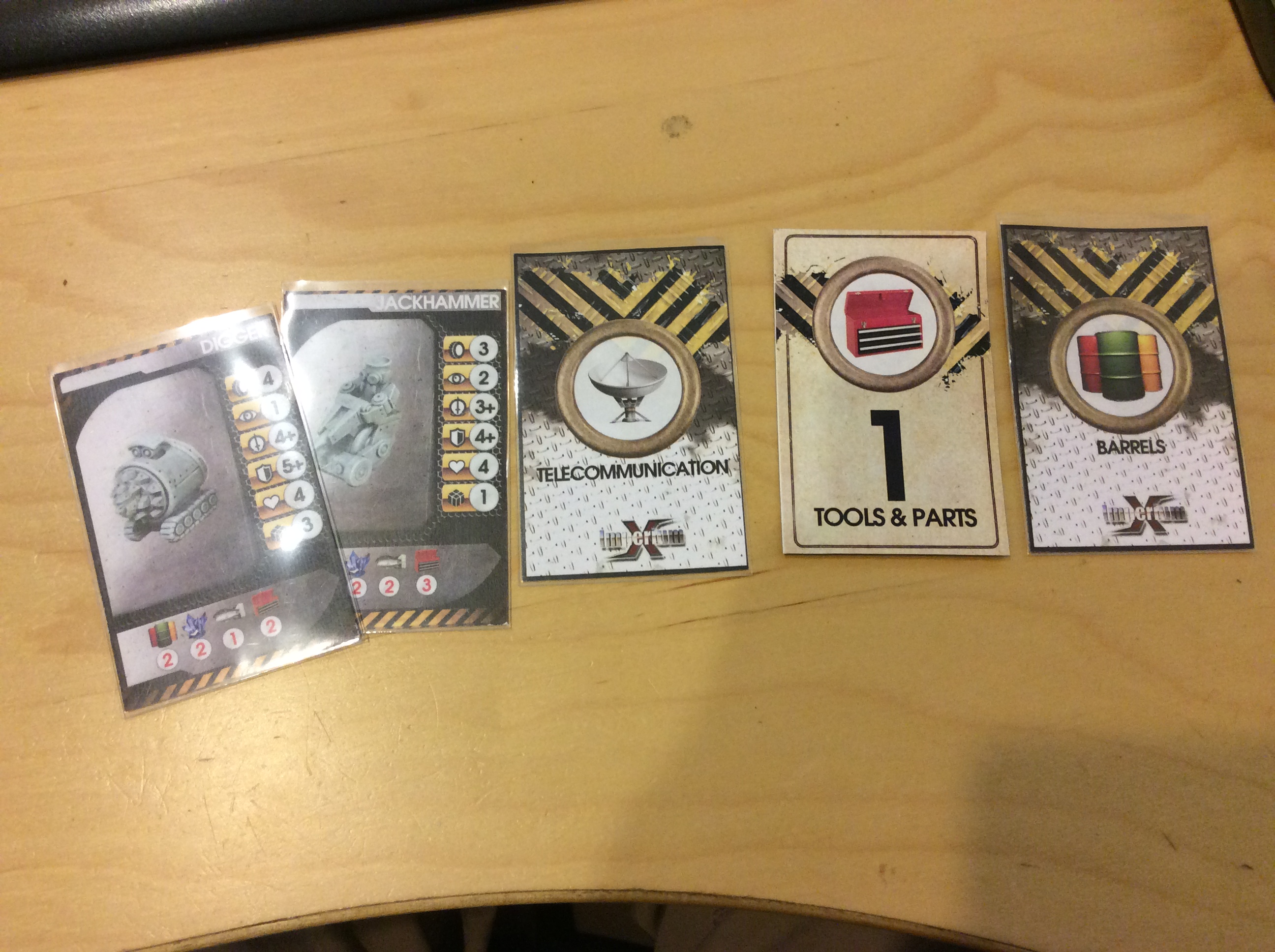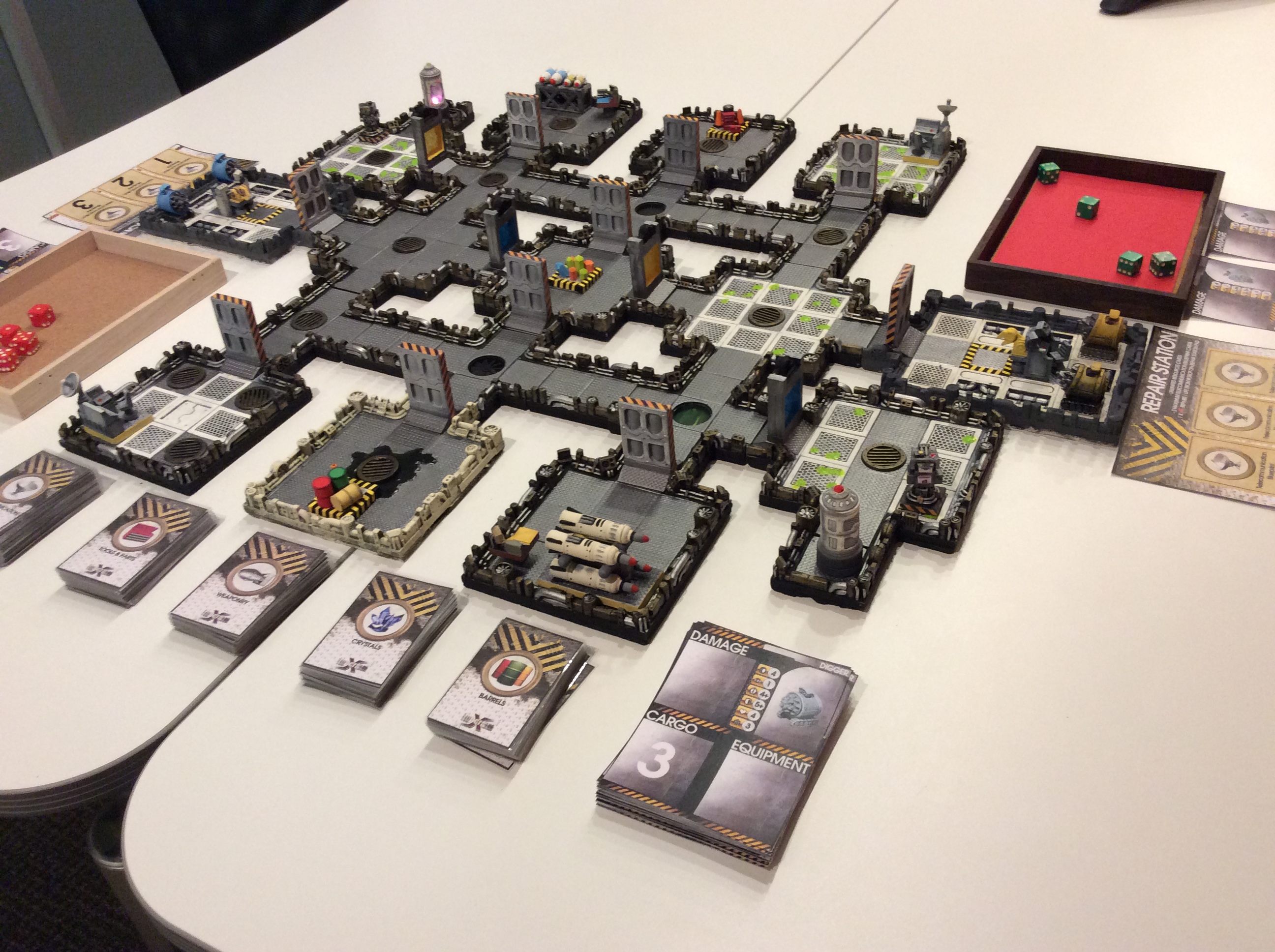 Including some "resources" cards... (weapon, tools, minerals and fuel) the robots could go to specific station and pick up a random card of that resource at the appropriate station). Picking up a card was costing 1 action point... and the random card would have 1, 2 or 3 of that resource. Each robot having different stats, some had more cargo then others (number of card you can carry)... You could go to a special station to acquire blueprints of new robots, sentries, etc... and to build them you had to fulfill the resource requirement of that blueprint. To do so you had to have all the resources and the blueprint at your building station.
