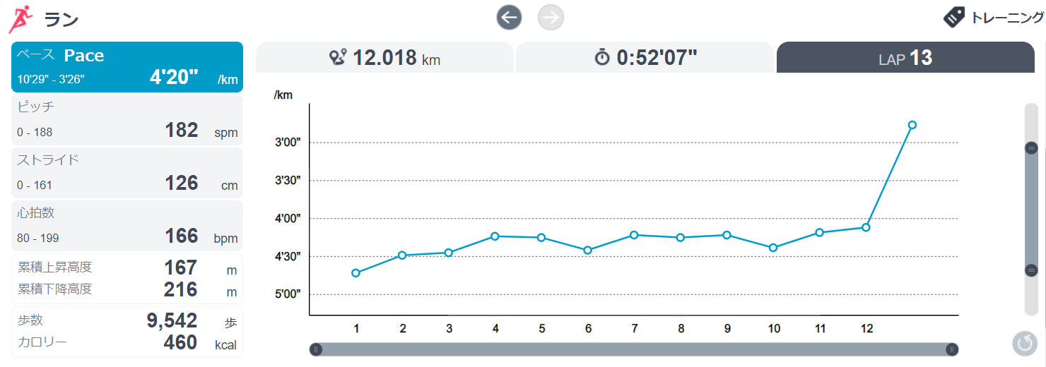 距離は12kmだけです。疲れをのこさないように短い距離をリラックスして走りました。