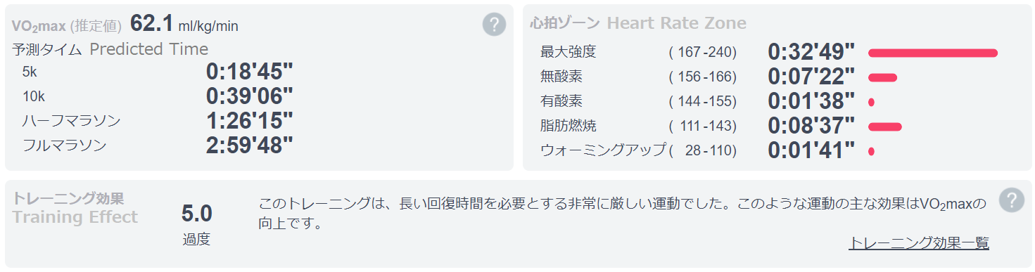 Estimated VO2max(推定最大酸素摂取量) : 62.1 mL/kg/min