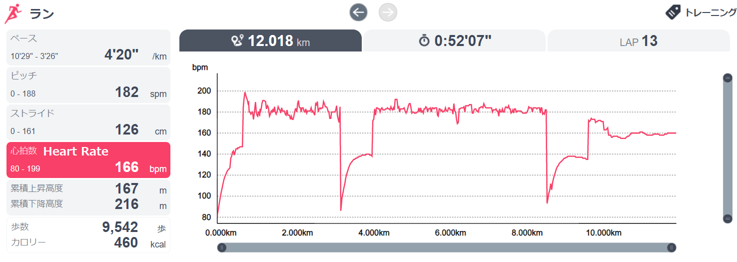 Average Heart Rate(平均心拍数): 166 bpm (Max : 199 bpm)