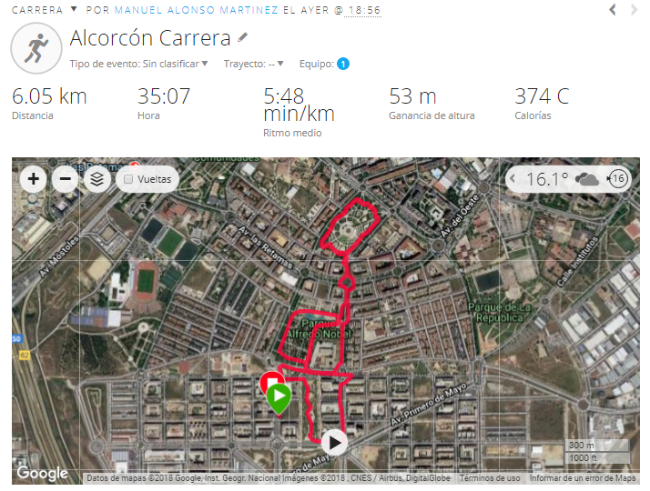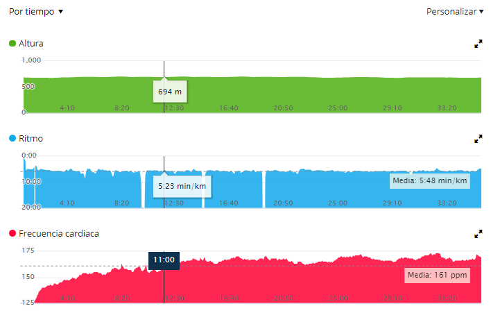 In the general career statistics, highlight the 60 meters of approximate height loss and gain and the average heart rate of 161 beats per minute. The optimal pace is not correct, sure that data is corrupted by having started running without the GPS watch had the signal 100% operational, but it was raining and wanted to start running as soon as possible xD