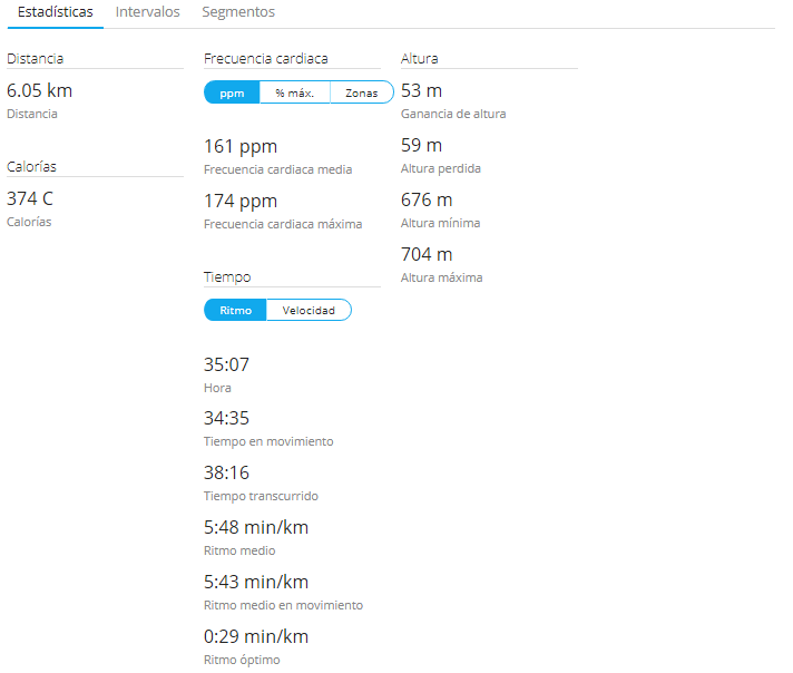 En las estadísticas generales de carrera, destacar los 60 metros de pérdida y ganancia de altura aproximados y la frecuencia cardíaca media de 161 pulsaciones por minuto. El ritmo óptimo no es correcto, seguro que ese dato está corrompido por haber empezado a correr sin que el reloj GPS tuviera la señal 100% operativa, pero es que estaba lloviendo y quería empezar cuanto antes a correr xD