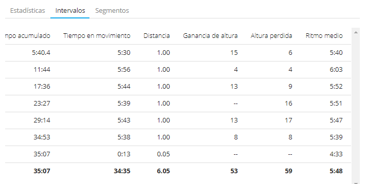 Estos son cada uno de los tramos de 1 kilómetro. Solo el segundo kilómetro por encima de los 6 minutos por kilómetro, en los demás, aunque hice las paradas, recuperé ese ritmo :-)