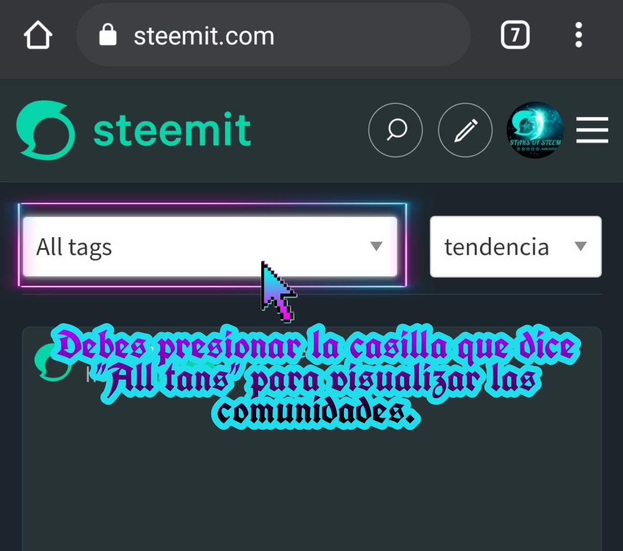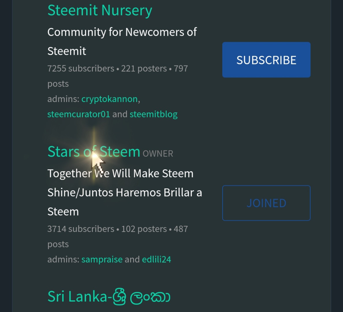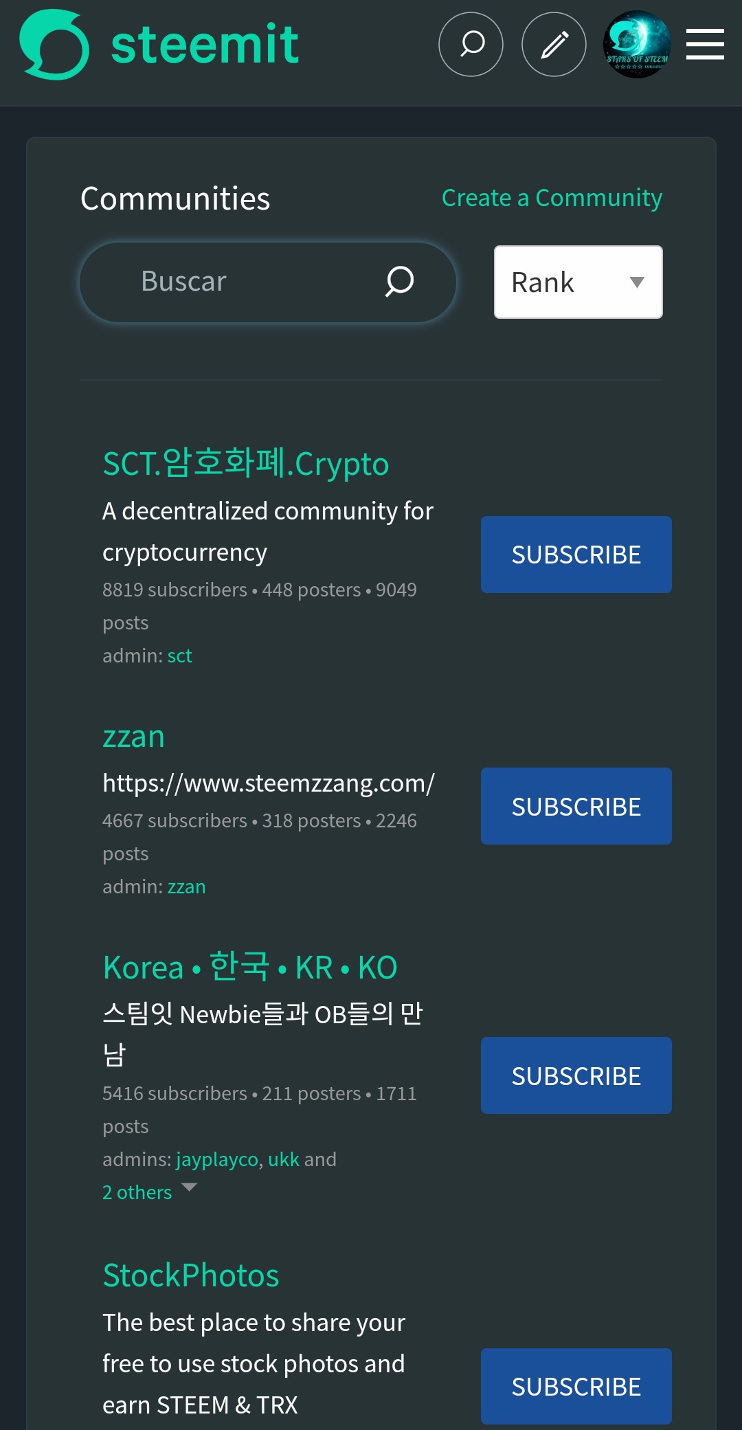 En este caso debes buscar nuestra comunidad “Stars Of Steem” y suscribirte, estamos seguros de que te sentirás como en casa: