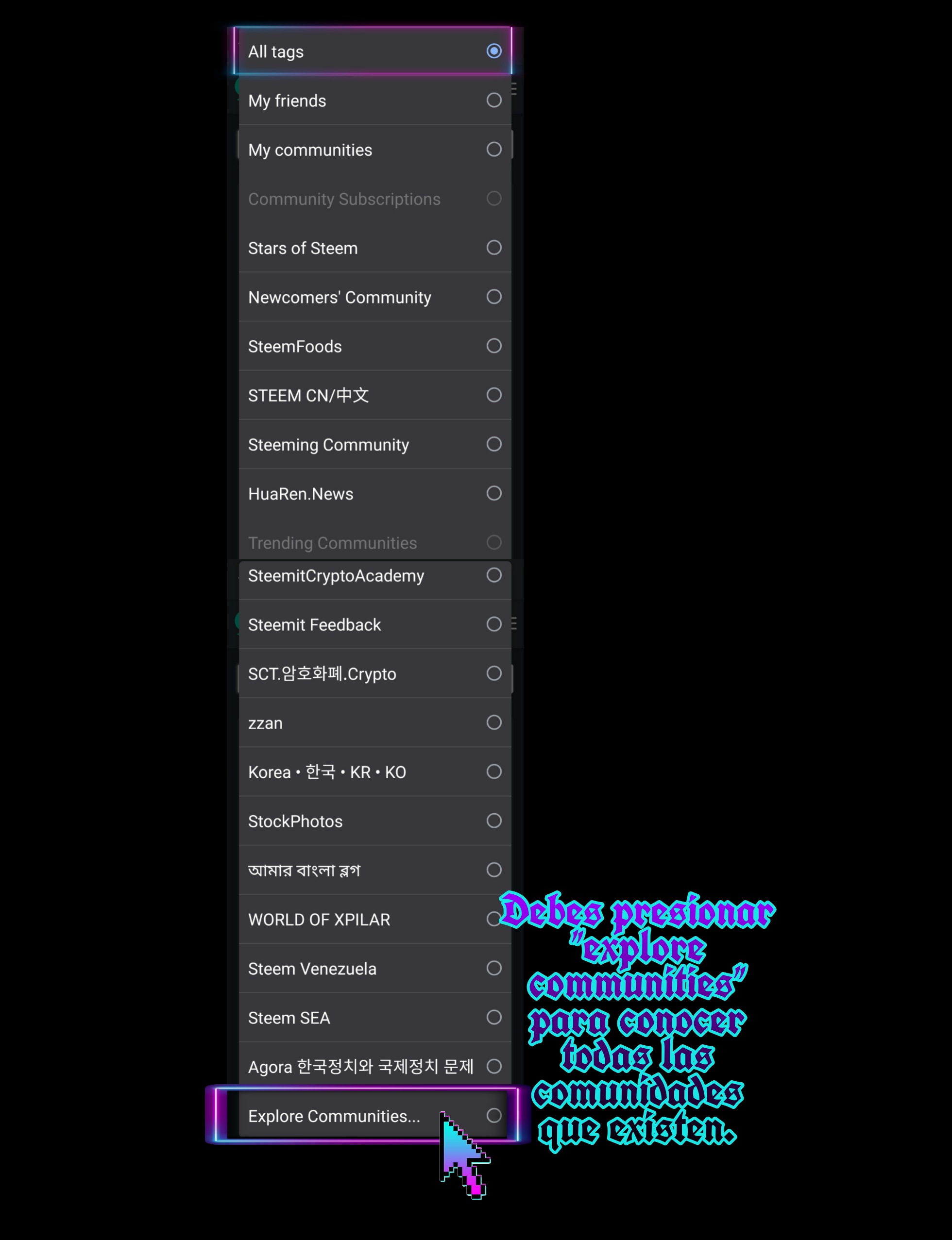 3- A partir de allí te aparecerán dos casillas, una para explorar las comunidades y otra para clasificar los post de dichas comunidades ( tendencias, nuevos o recientes, pagos...); Tienes que dar click en la casilla que dice “All tangs”, es decir la casilla izquierda.