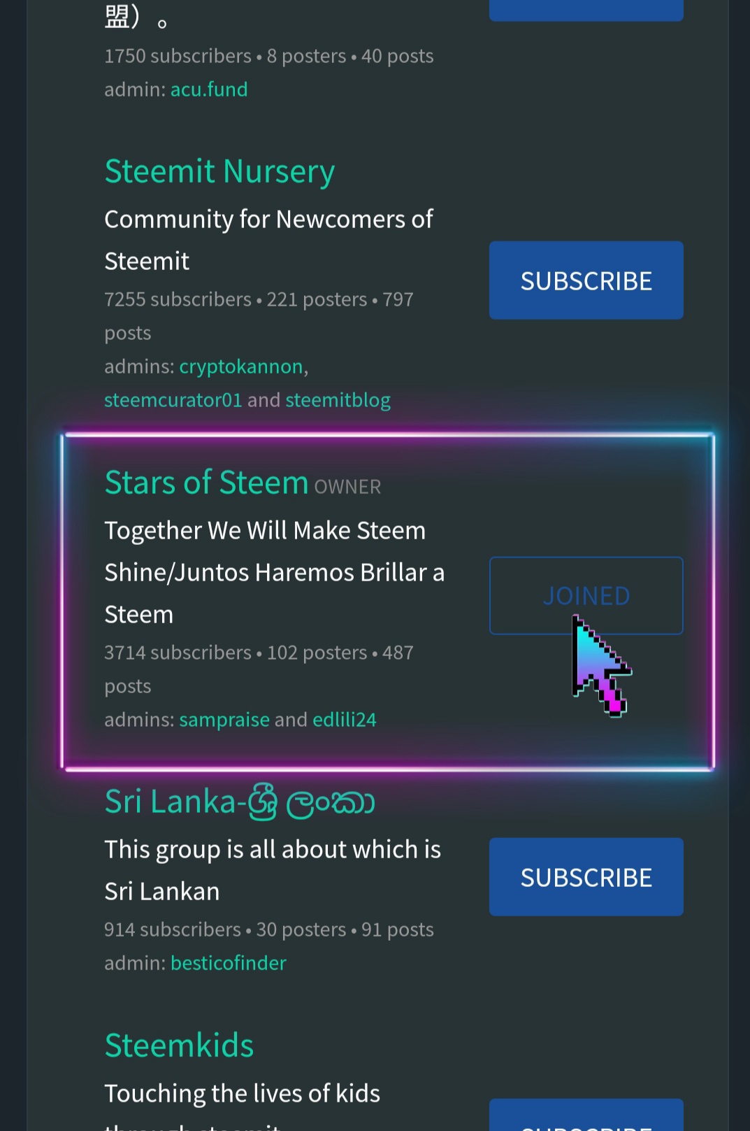 Puedes suscribirte directamente dónde sale el botón “SUBSCRIBE” o entrar a la comunidad que desees para conocer de que trata y después suscribirte.