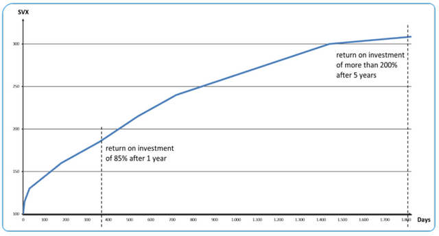 The total supply is recalculated with each token transfer executed by the smart contract. This way the staking mechanism gets by without any external triggers. All Savix balances will grow up to 3 times of the initial investment during the first 5 years.