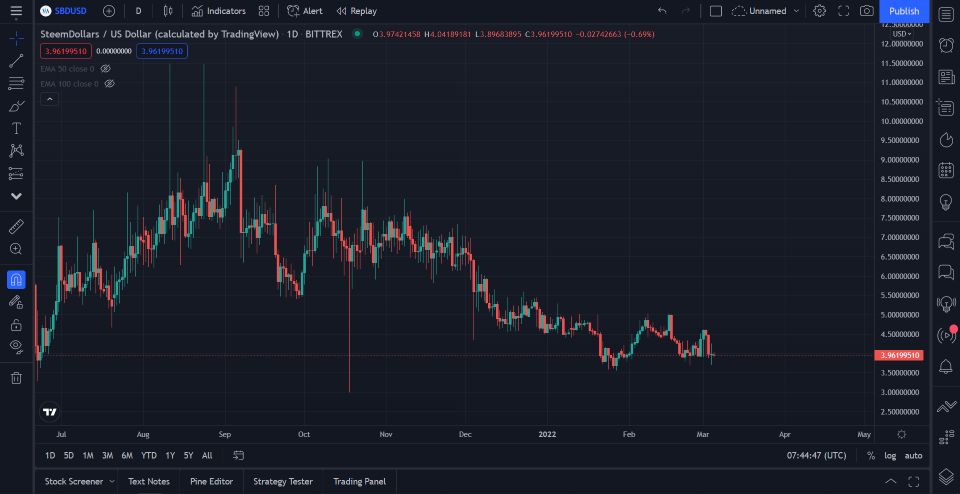 SBD current price on March 6, 2022erev (60)in #sbd • 4 years ago The price of SBD today is at the level of $3.9619 #cryptocurrency #currentprice #tradingview