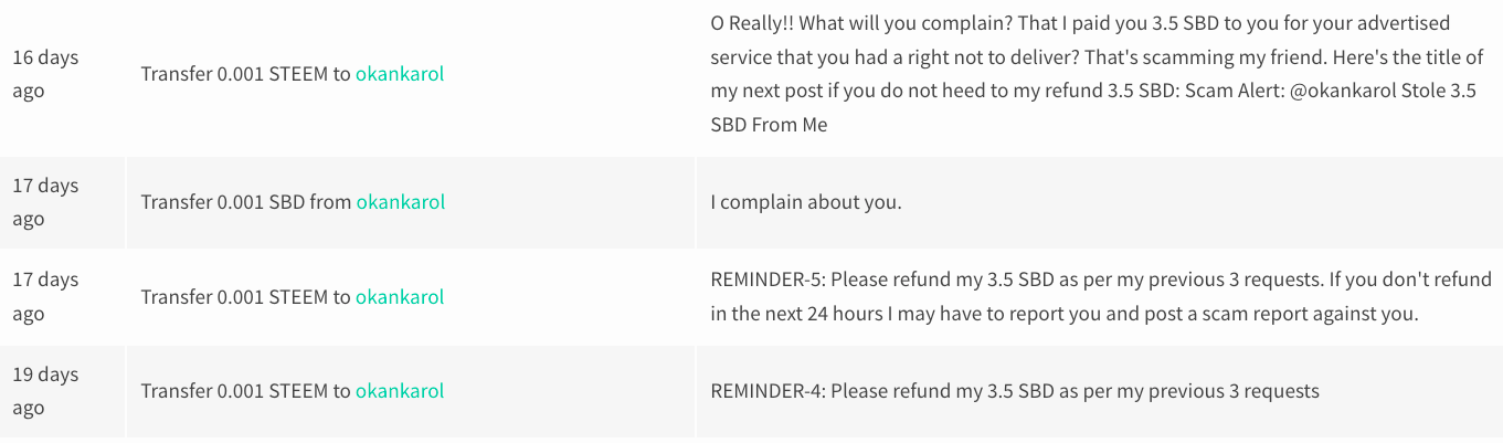 O Really!! What will you complain? That I paid you 3.5 SBD to you for your advertised service that you had a right not to deliver? That's scamming my friend. Here's the title of my next post if you do not heed to my refund 3.5 SBD: Here’s the title of my next post if you do not heed to request for a refund: Scam Alert: @okankarol Stole 3.5 SBD From Me