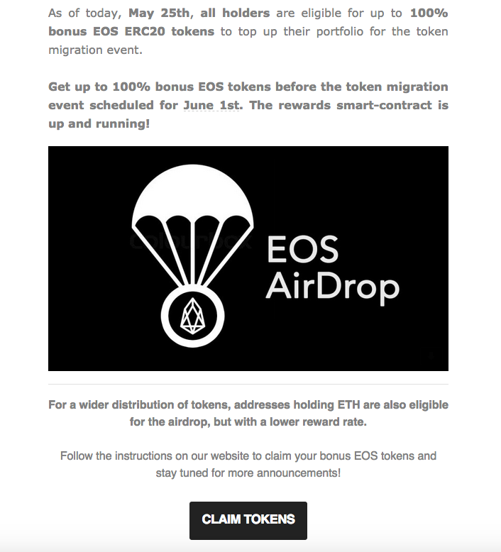 Scam Email Posing as EOS Offering Airdrop Bonus Tokens Warning!!!!!