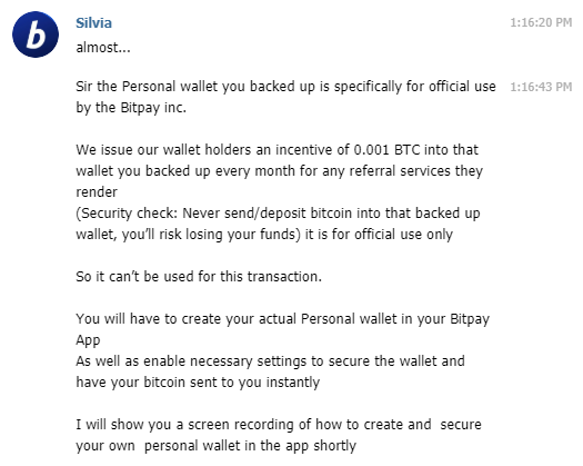 Escribo esto solo para alertar a usuarios noveles o poco observadores, el día de ayer recibí un mensaje por Telegram de una moderadora de un grupo con temática de una criptomoneda aun en desarrollo en dicha plataforma de mensajes, por lo que parecía de confianza, me decía que en bitpay estaban pagando $140 UsD por cada token de dicha cripto, lo que ya era de por si muy sospechoso dado que su valor actual ronda $1 dolar, pero decidí investigar.