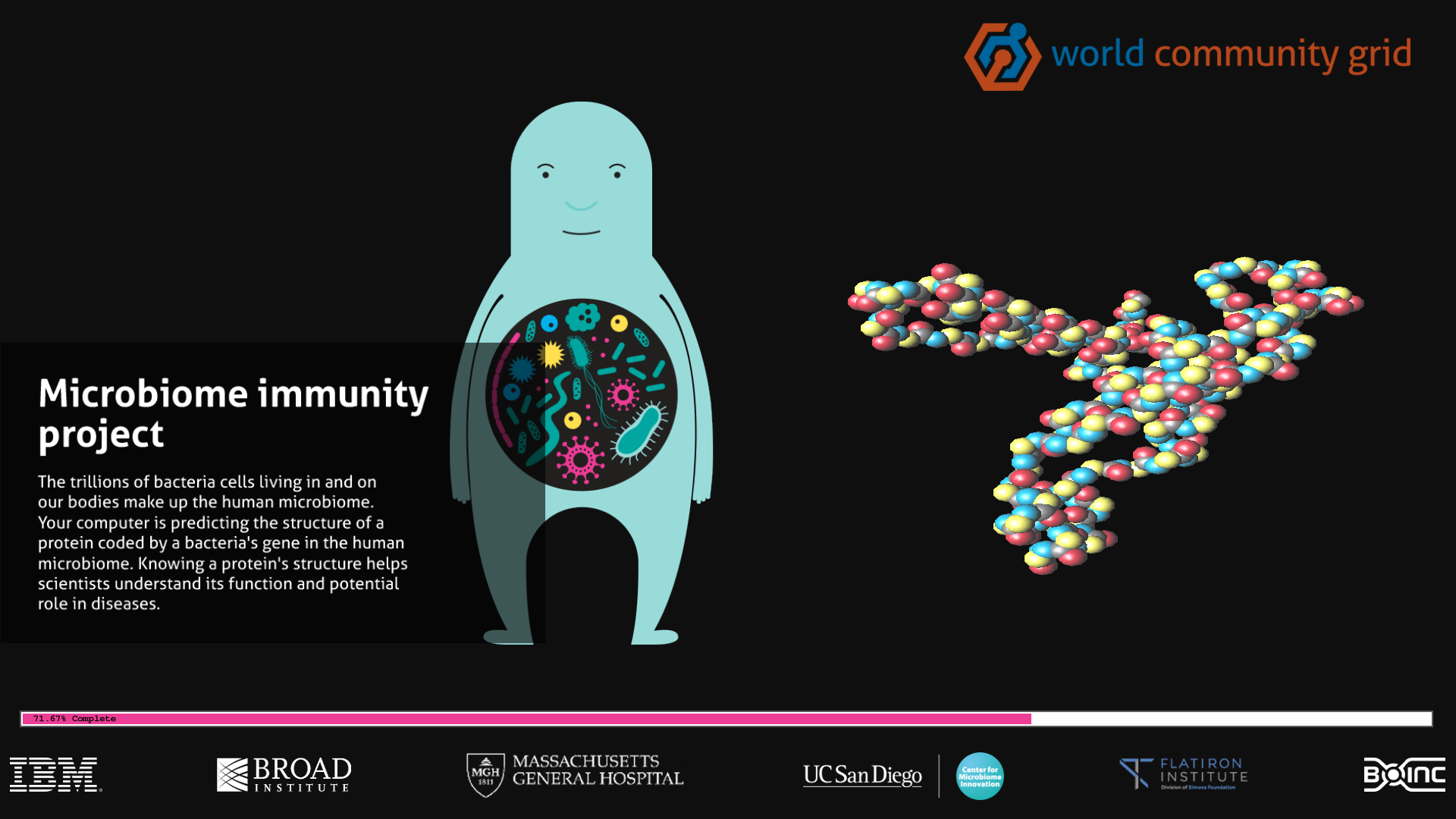 That's why I wanted to capture and share some of the BOINC screen saver graphics. The screenshots are below. They are mostly from the excellent World Community Grid BOINC project. All are taken with 1920x1080 resolution.