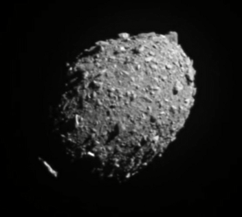 Images taken shortly before impact show the surface of Dimorphos to be gray and rocky with an egg-shaped bulge.