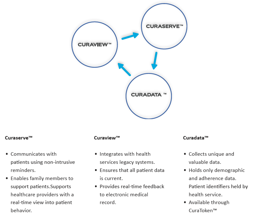 The approach involves an ecosystem that constitutes of CuraServe, CuraView, and CuraData, as the components. These components are complimentary in reducing the unhealthy effect of Non Adherence and were illustrated below with a brief highlights of their respective functions.