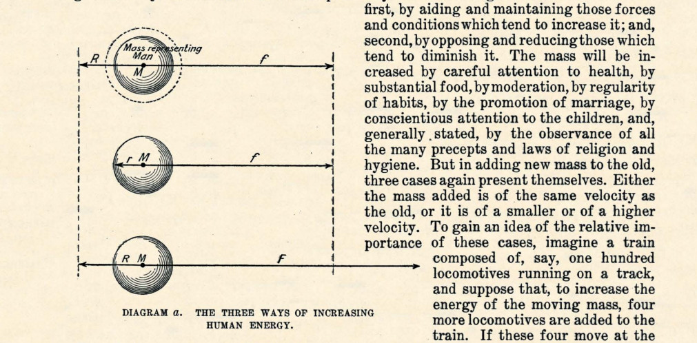 Let, then, in diagram a, M represent the mass of man. This mass is impelled in one direction by a force f, which is resisted by another partly frictional and partly negative force R, acting in a direction exactly opposite, and retarding the movement of the mass. Such an antagonistic force is present in every movement and must be taken into consideration. The difference between these two forces is the effective force which imparts a velocity V to the mass M in the direction of the arrow on the line representing the force f. In accordance with the preceding, the human energy will then be given by the product ½ MV² = ½ MV x V, in which M is the total mass of man in the ordinary interpretation of the term "mass," and V is a certain hypothetical velocity, which, in the present state of science, we are unable exactly to define and determine. To increase the human energy is, therefore, equivalent to increasing this product, and there are, as will readily be seen, only three ways possible to attain this result, which are illustrated in the above diagram. The first way shown in the top figure, is to increase the mass (as indicated by the dotted circle), leaving the two opposing forces the same. The second way is to reduce the retarding force R to a smaller value r, leaving the mass and the impelling force the same, as diagrammatically shown in the middle figure. The third way, which is illustrated in the last figure, is to increase the impelling force f to a higher value F, while the mass and the retarding force R remain unaltered. Evidently fixed limits exist as regards increase of mass and reduction of retarding force, but the impelling force can be increased indefinitely. Each of these three possible solutions presents a different aspect of the main problem of increasing human energy, which is thus divided into three distinct problems, to be successively considered.