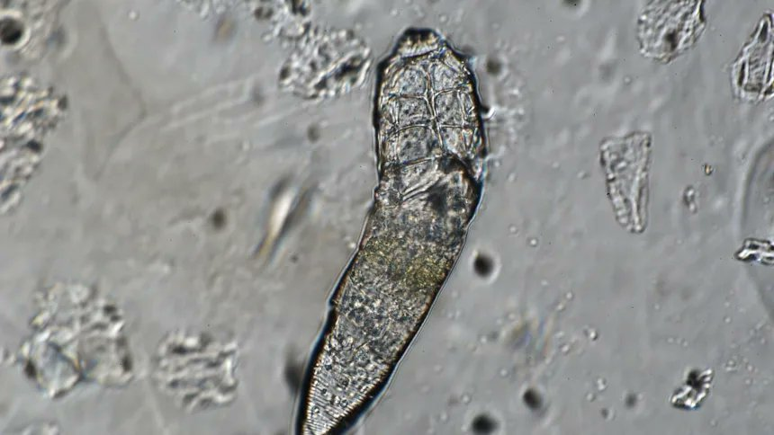 This demodex mite from a skin sample is shown under a microscope.