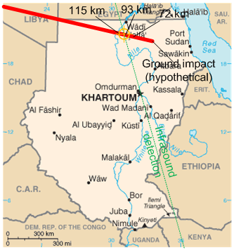 Ground track and probable explosion point in midair of the asteroid 2008 TC3 which entered earth's atmosphere and exploded over Sudan on 2008-10-06..wikimedia
