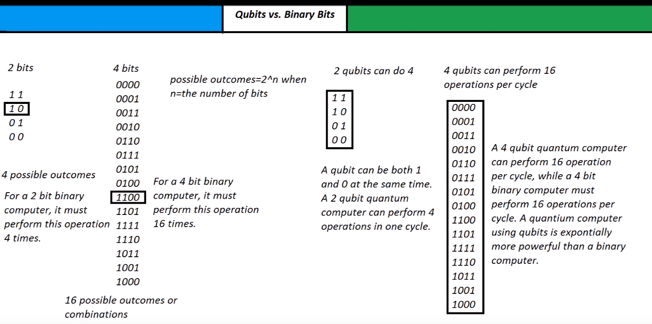 At the most basic level, classical computers complete their calculations using bits. Each bit can take on the value of either a “1” or “0” and long strings of these bits can be used to represent everything the computer processes. For example, in the right context a number in binary could represent a specific number, letter, or color. If you take a look at the visual below, each additional bit doubles the total number of combinations for your computer to process.