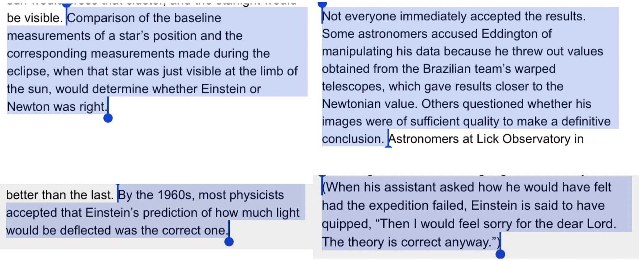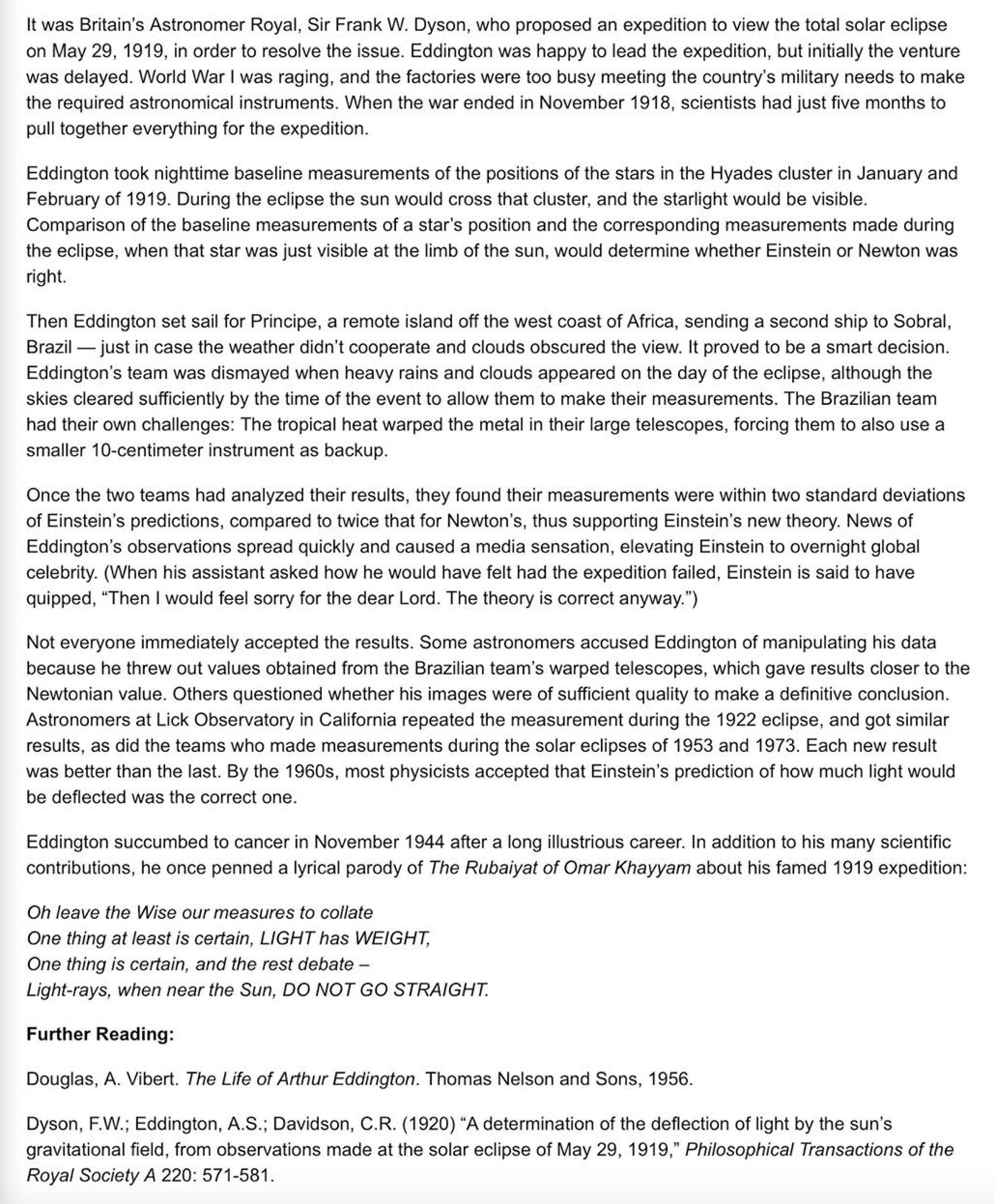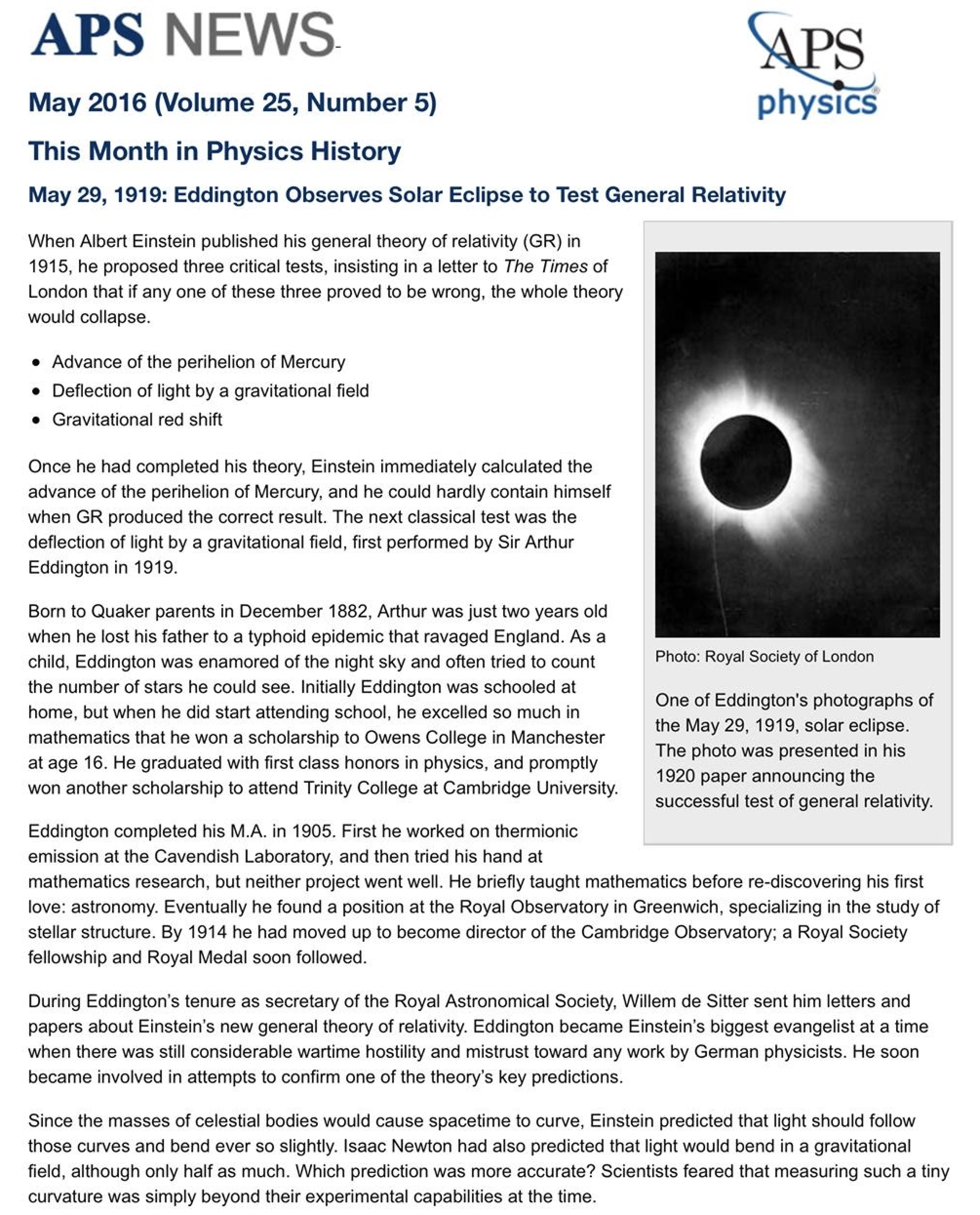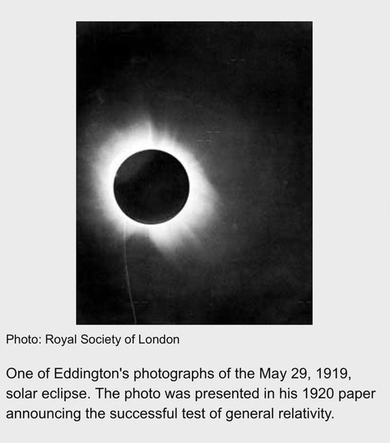 So Eddington refused to acknowledge the data collected from the Brazilian team. Which showed calculations closer to newtons model. But Eddington was an Einstein fanboy and zealot. So he declared Einstein correct overnight that relativity was proved true from the solar eclipse picture.