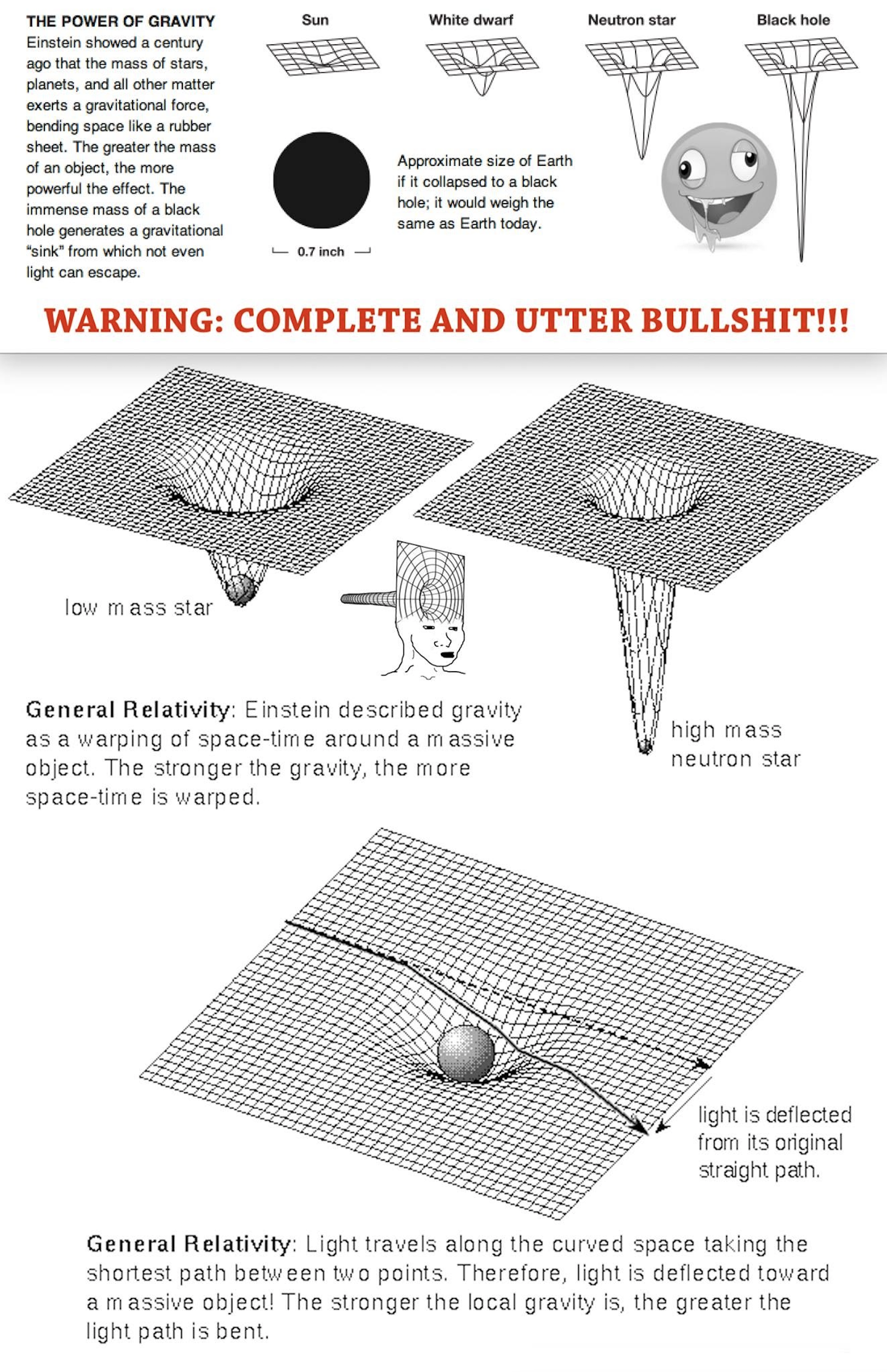 Again, on the left is what Relativity assumes we SHOULD see. How Relativity is PORTRAYED in textbooks and universities. Non-existent space curvature/ distortion/ warping/ bending. Never been observed in the history of astrophysics or satellite imagery.