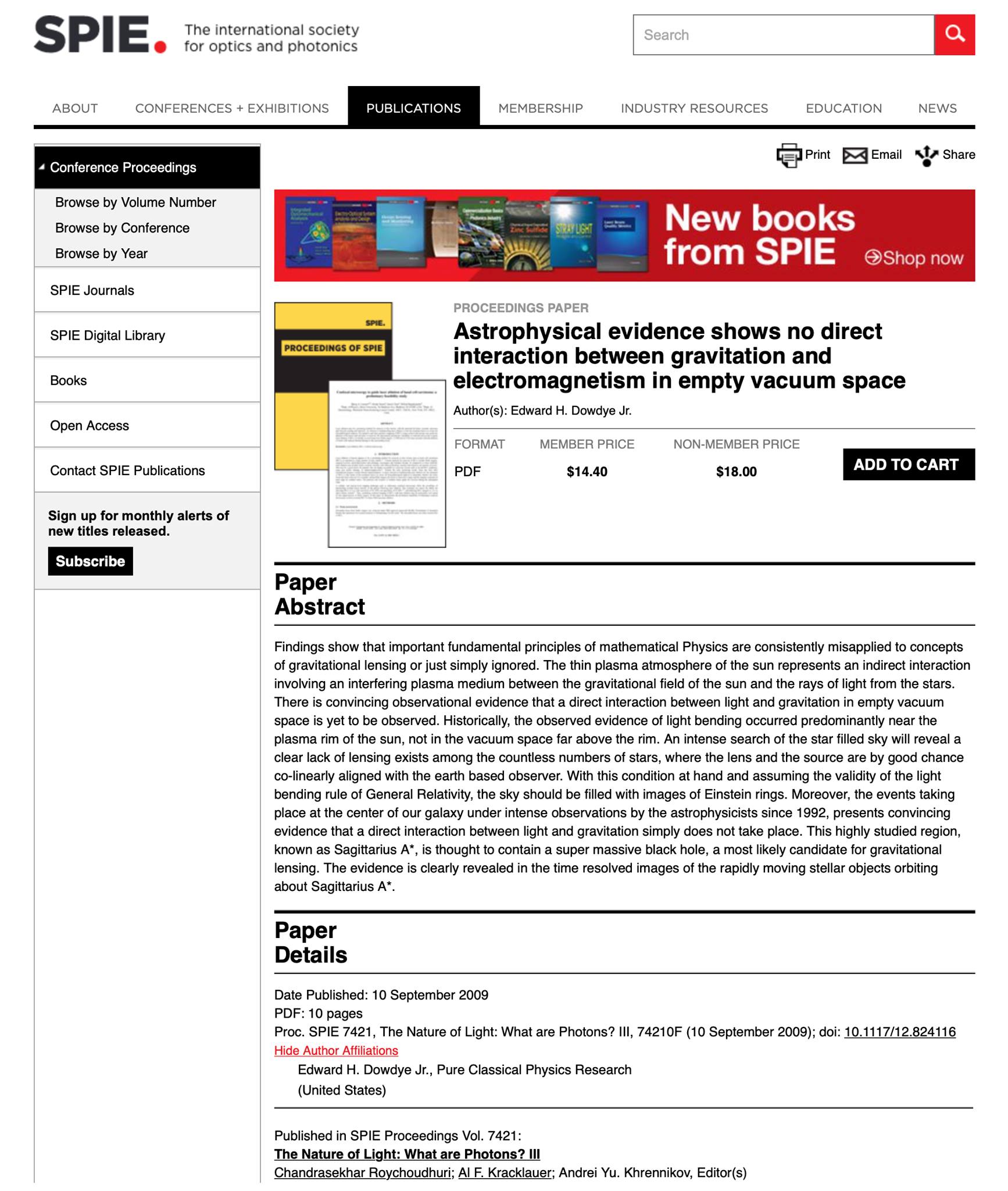 "The Sun cannot be a gas. The gaseous model is proven false by the Sun's thermal spectrum alone. Only condensed matter emits a thermal spectrum. Gases cannot do so because they do not have a lattice structure. Furthermore, in the lectures above, the theoretical pillar of gaseous stars is Eddington's mass-luminosity relation.