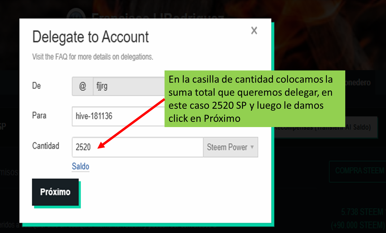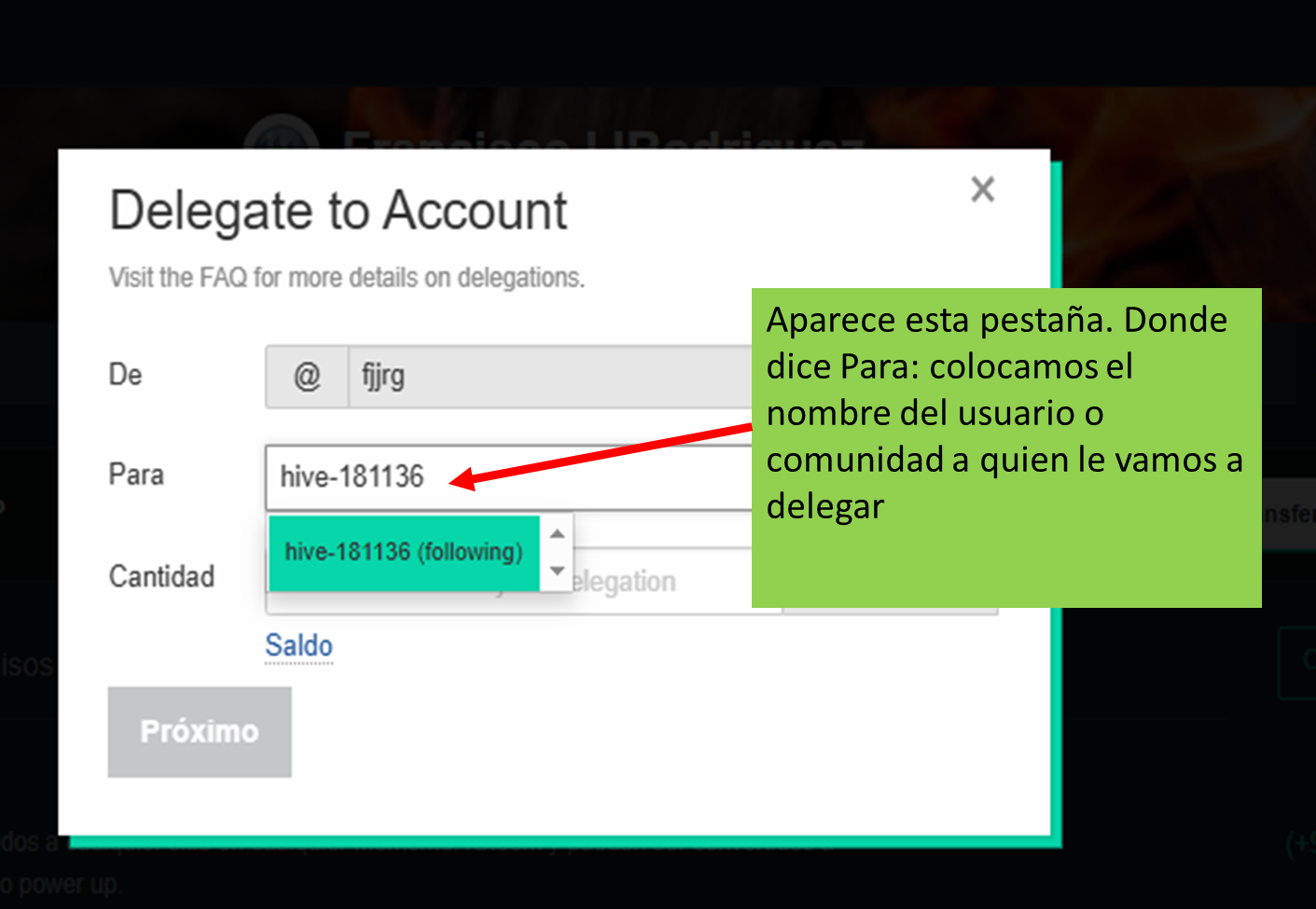 2 En la casilla "Para:" colocamos el nombre de la cuenta curadora a la que le vamos a delegar, en nuestro caso escribimos "hive-181136"