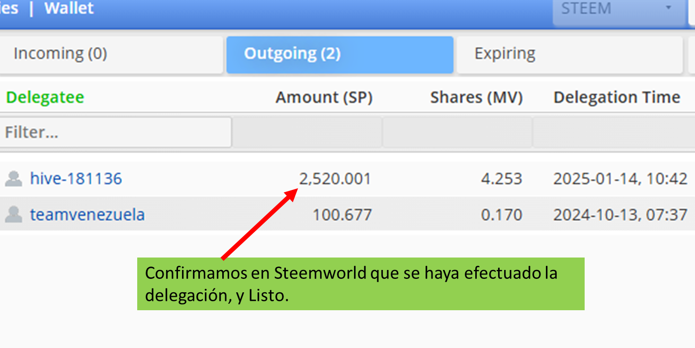 5 Ya en este paso la delegación se ha realizado y si queremos confirmar, nos vamos a steemworld y verificamos la delegación.