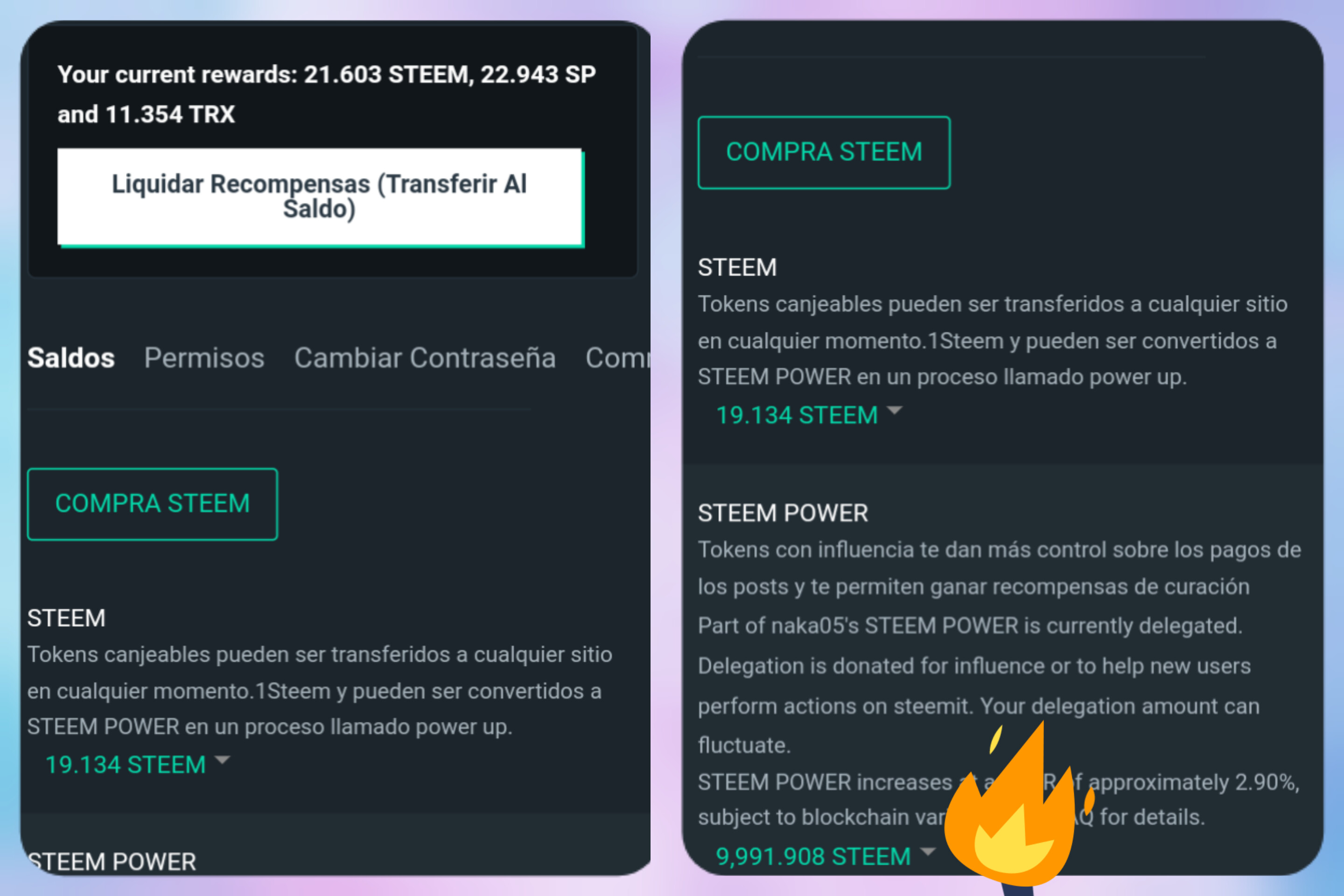 Ya a escasos steem para lograr superar mis primeros 10 k, ingrese a mi wallet y me encontré con una recompensa de 21.603 steem , 22.943 sp y 11.354 trx, esto me permitió alcanzar mi meta antes de encender 😃😃😃