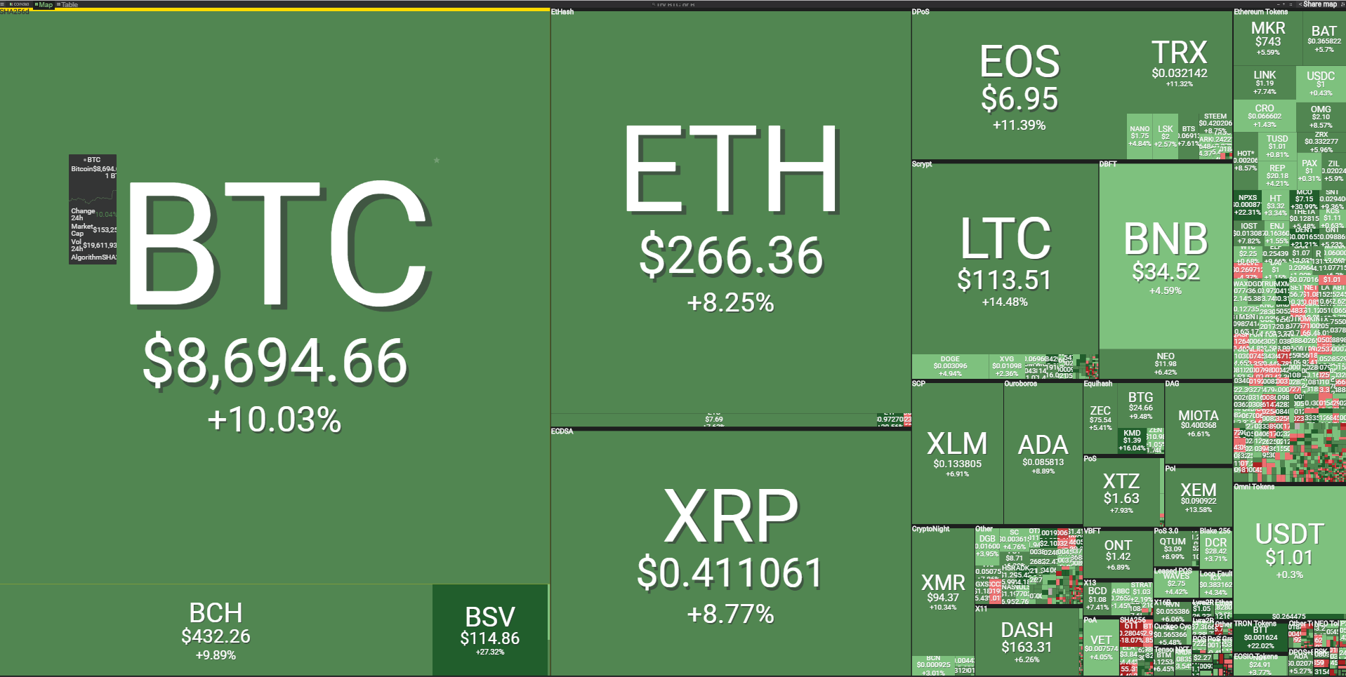 [19. 5. 27. 코인 뉴스] 비트코인 $8,000을 넘어 $8,800 터치. 덩달아 메이저 알트코인도 좋은 모습을 보여.