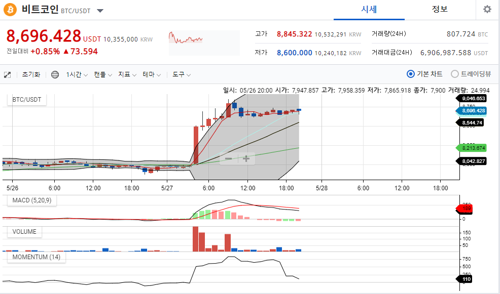 $8,000 위 아래로 횡보하던 비트코인은 금일 새벽 5시경 거래량을 터트리며, $8,500까지 치솟아 올랐고, 그 기세를 이어 $8,800을 찍고 내려와 $8,600 선에서 호흡을 고르고 있습니다. 원화로는 1천만원을 넘으며, 사람들의 이목을 집중시킬 수 있었습니다.