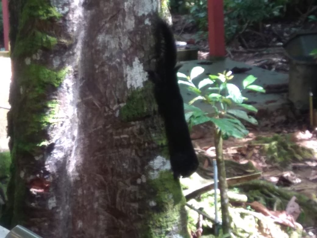 Tupai hitam atau black squirrel ini tergolong sudah langka termasuk di lindungi, badannya hitam tetapi di bagian bawah perutnya merah kecoklatan, bila kita letakkan makanan di tanah di bawah pohon kayu maka tupai ini turun ketanah mengambil makanan, setelah mengambil makanan tupai ini naik kembali ke pohon kayu, tetapi bila kita memberikan makanan dengan tangan kita juga tupai ini mengambilnya, setelah mengambil makanan yang kita sodorkan maka di lansung naik lagi ke pohon tetapi selesai dia makan turun kembali. Bila tupai ini kenyang maka tidak turun dari pohon kayu yang besar serta tinggi sehingga tidak semua pengunjung dapat melihat tupai ini.