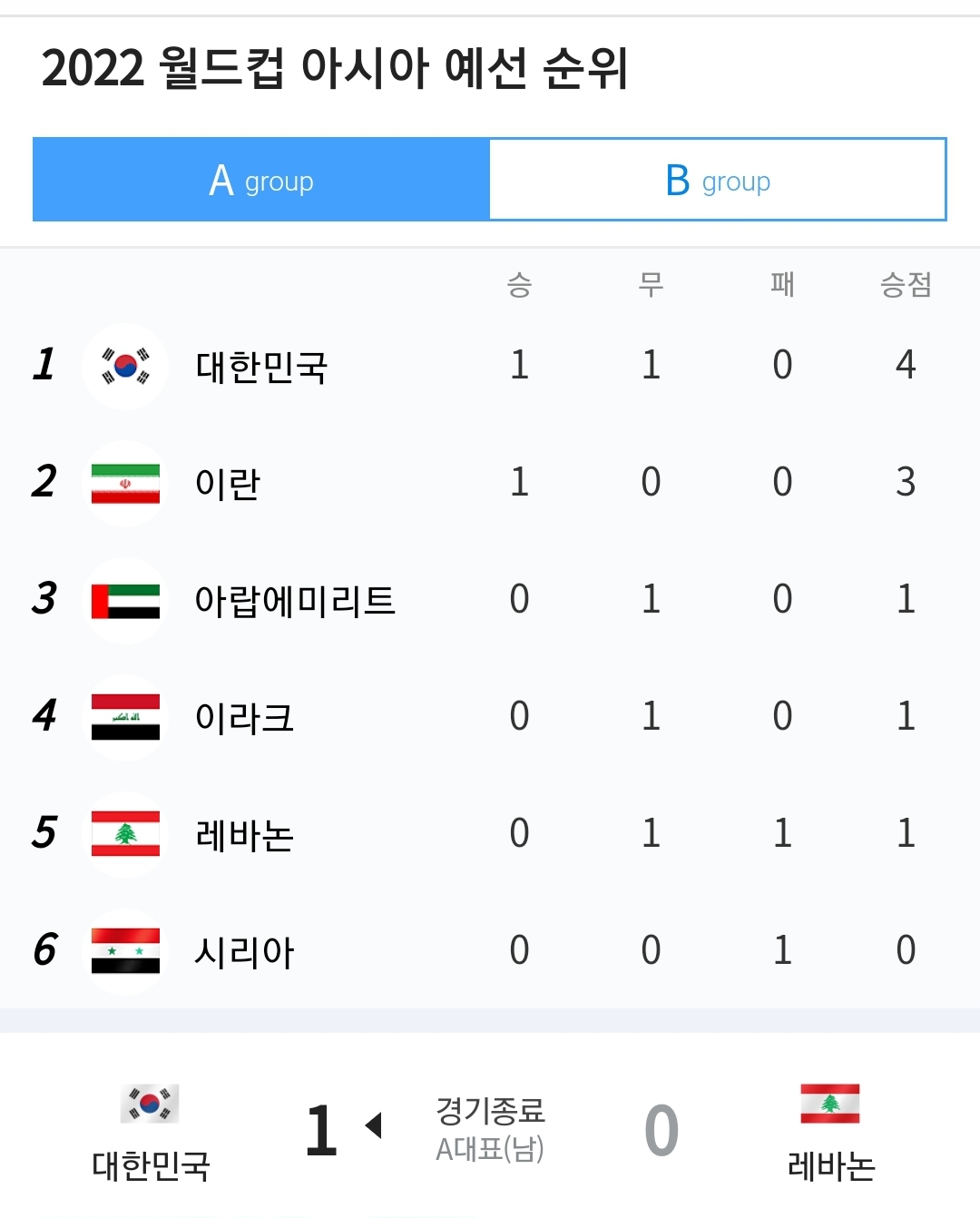 2위가 1승1무 대한민국
