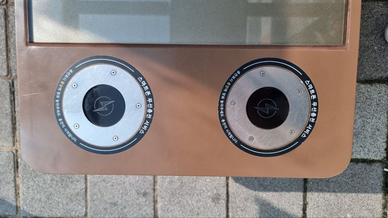 버스 정류장에서 버스를 기다리는데 벤치를 보니 무선충전기가 보이더군요.