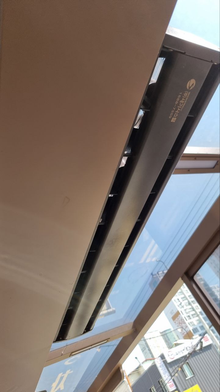 상점에 에어콘 바람이 나가는 걸 막기 위한 에어 커튼 같은 것을 동작시켜서 잠시나마 땀을 식히게 하는 것 같아 보였습니다.