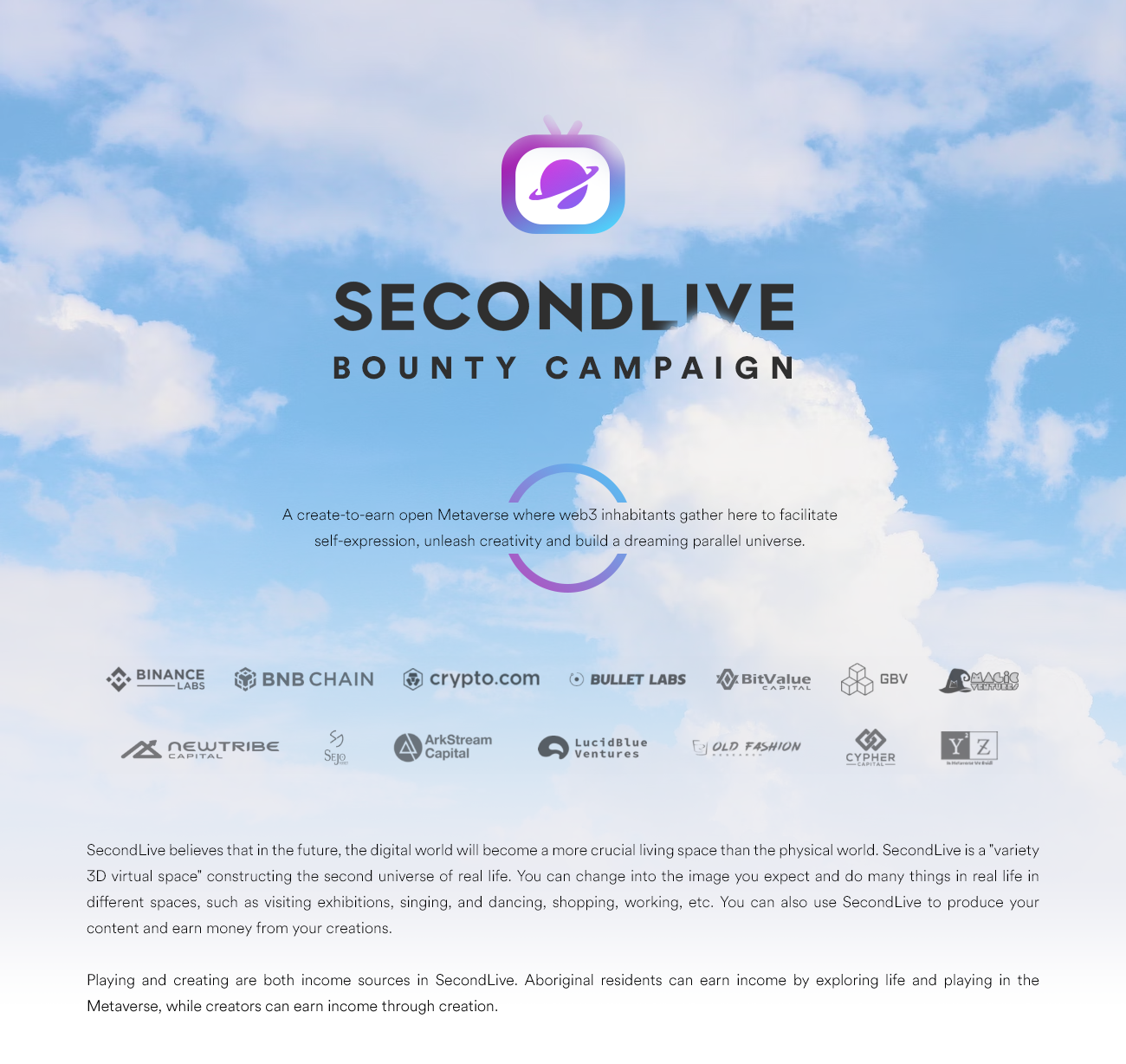 Bounties are prizes that the SecondLive Platform provides in exchange for special work, performed by participants with prizes usually in the form of tokens. Usually this work is in the form of promotions on various social media from each participant. As currently underwayhttps://dappradar.com/blog/40000-in-prizes-and-explore-the-metaverse-on-bnb-chain