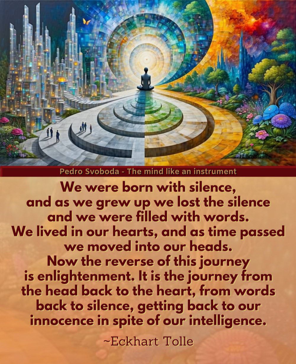 Now the reverse of this journey is enlightenment. It is the journey from the head back to the heart, from words back to silence, getting back to our innocence in spite of our intelligence.