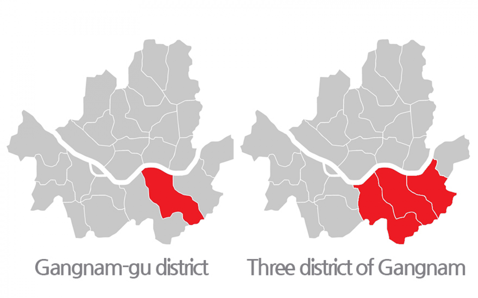 Seoul is traversed by the Hangang river which flows from east to west. The whole area north of the river is called Gangbuk, and the south of the river is called Gangnam. (Korean word ‘gang’ means river, ‘buk’ is north, and ‘nam’ is south.) So, this is the wider definition of Gangnam. Then, there is an administrative district named Gangbuk-gu in the Gangbuk area, and an administrative district named Gangnam-gu in the Gangnam area. This is the narrow definition. And there is a third definition. When Gangnam is mentioned, it usually refers to the three adjacent districts of Seocho-gu, Gangnam-gu, and Songpa-gu. These three districts have many characteristics in common, the first of which is the skyrocketing costs for housing.