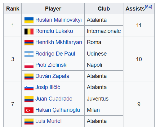 As for the assists, it was a good competition where 2 players were able to provide the highest number of assists this season: Romelu Lukaku (Inter Milan) and Ruslan Malinovskyi (Atlanta) both with 11 assists.
