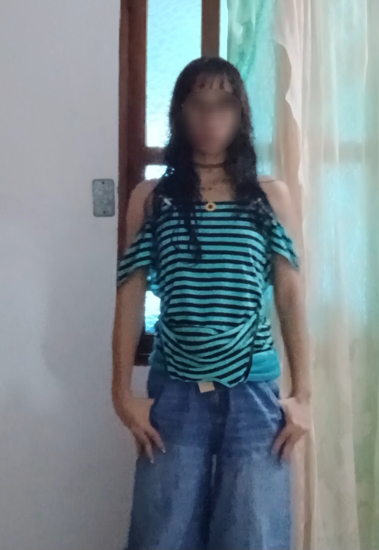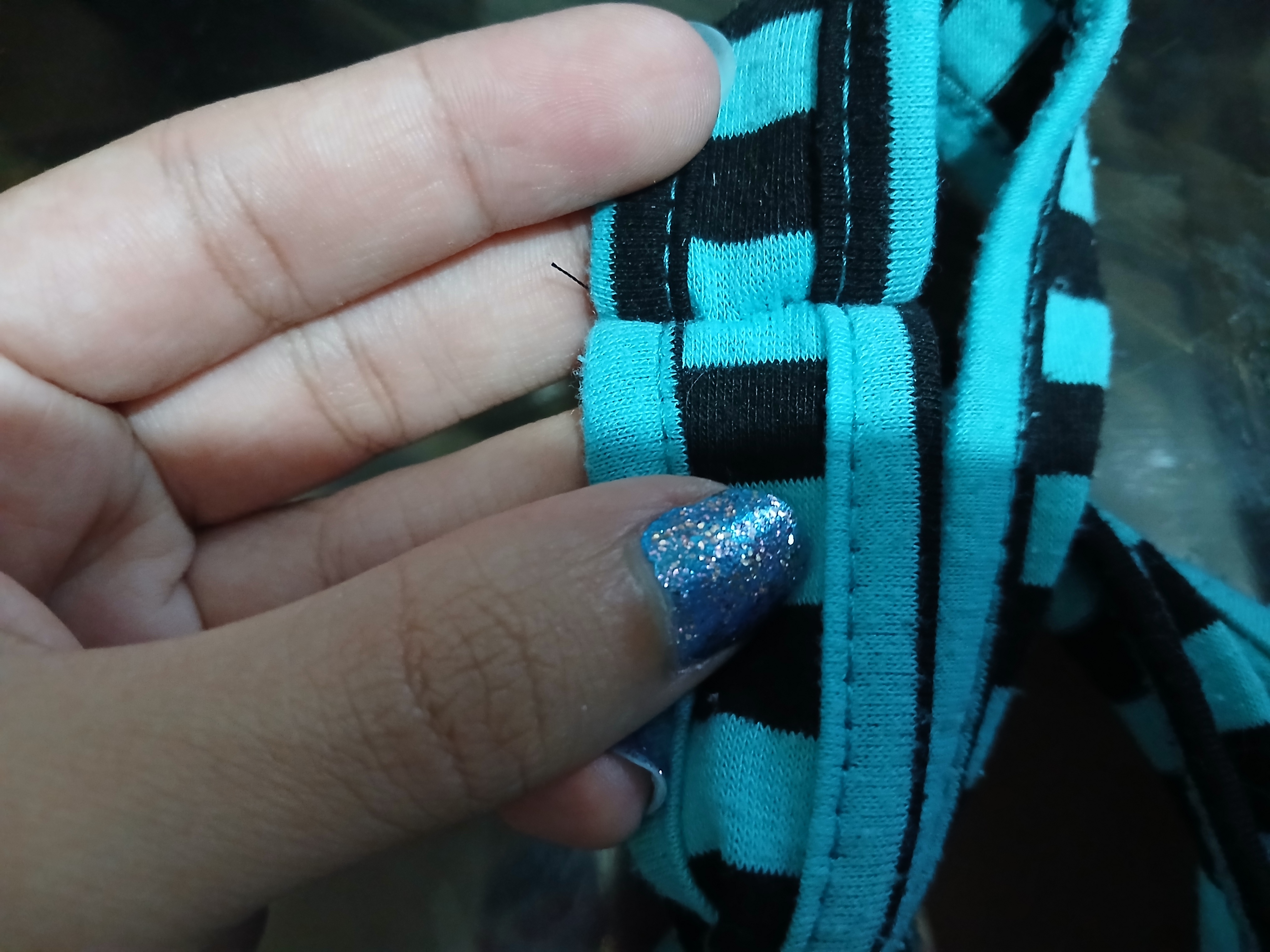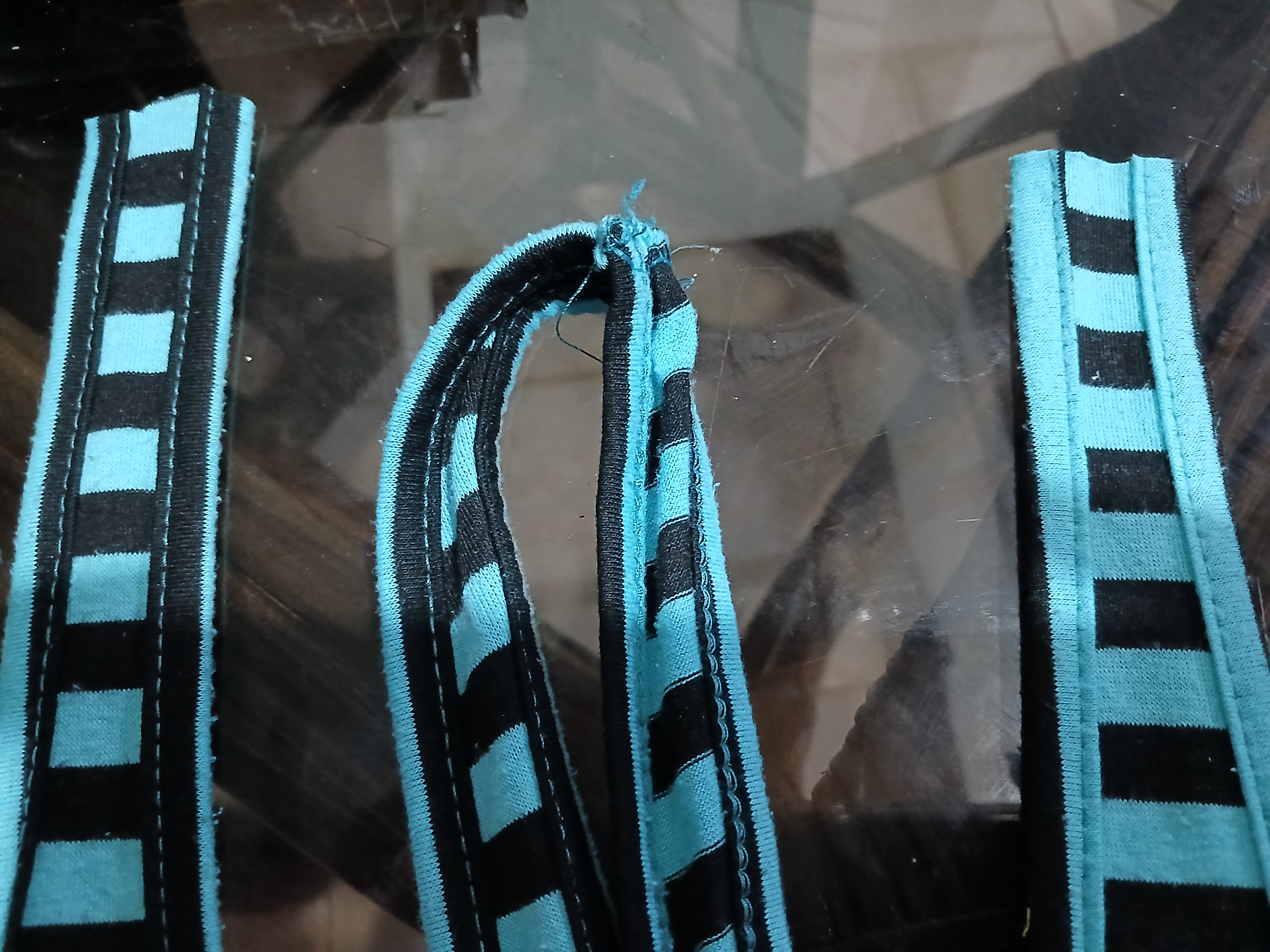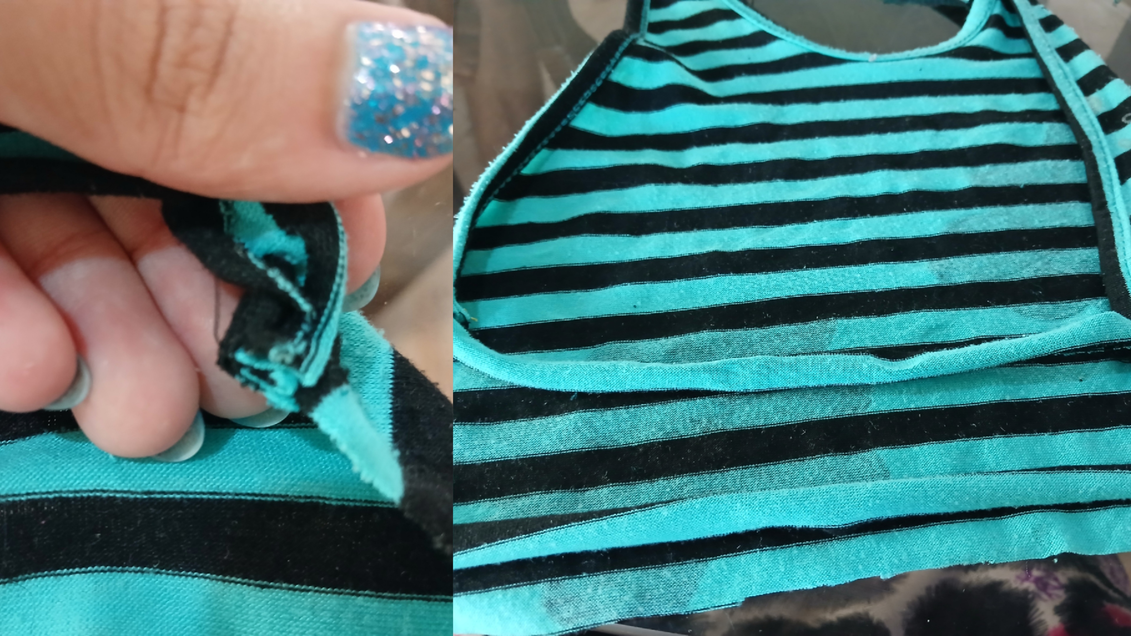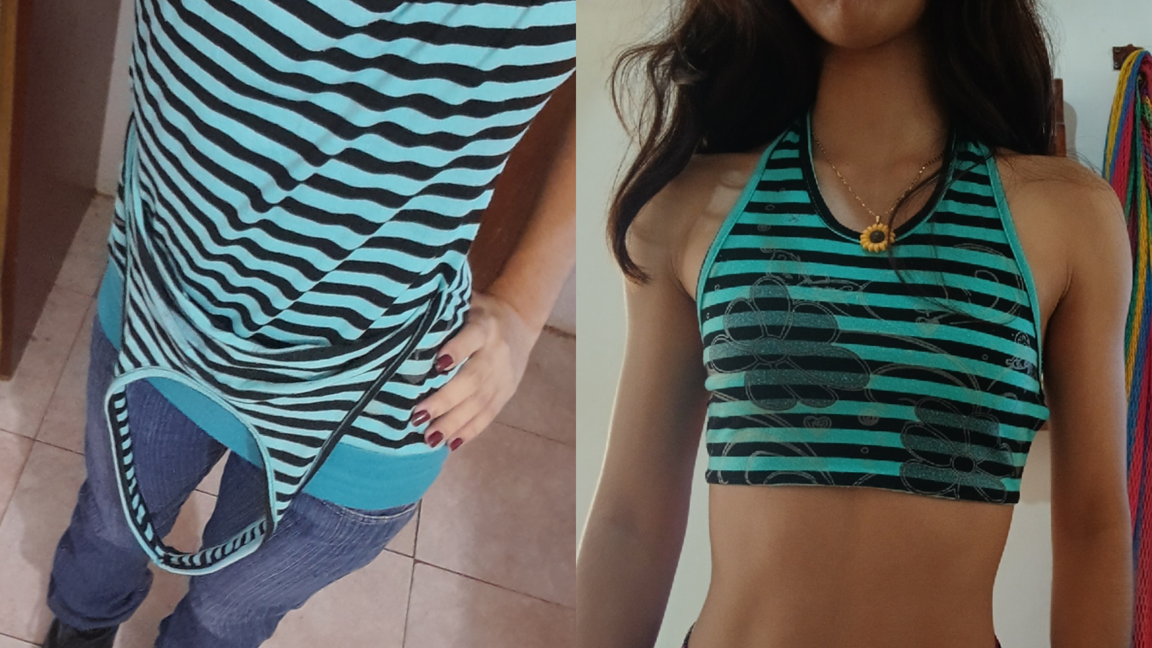 Luego, para los extremos del top, corté aproximadamente 3 cm de la parte de abajo y lo dividí en 2 tiras, a diferencia de mis tops tejidos, estas tiras no iban a ir cruzadas, simplementes las uní a cada lado, tuve que cortarlas casi que a la mitad del largo original ya que la tela era elástica y la idea es que fuese ajustado.