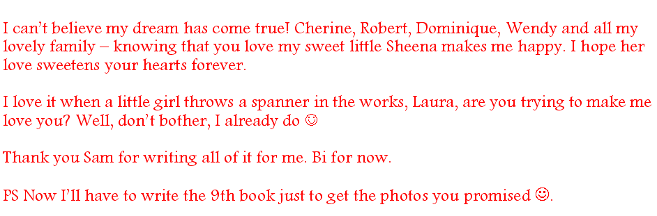 We should have guessed that Robbie would refuse to give up Sheena. The next day he explained to them about Sheena being a part of our family and how we will be keeping her young and alive for many centuries. He told them they are not ready yet to become Cherinians, but that when they are, Cherine will link them. He then asked them to make Freddie their home so that Sheena can be with them while also remaining with us. They have agreed.