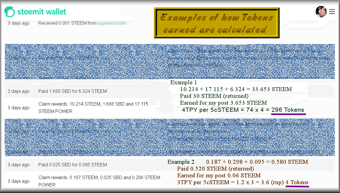 (0.21Steem/5c = 4 * 1tpy = 4 TPY Tokens) (I always round up, so in this case, 5TPY are earned)