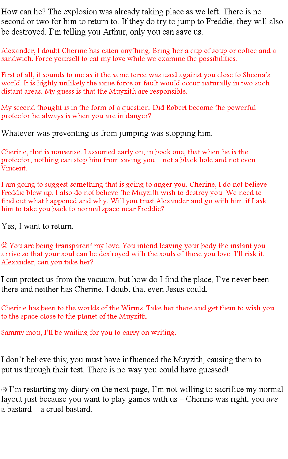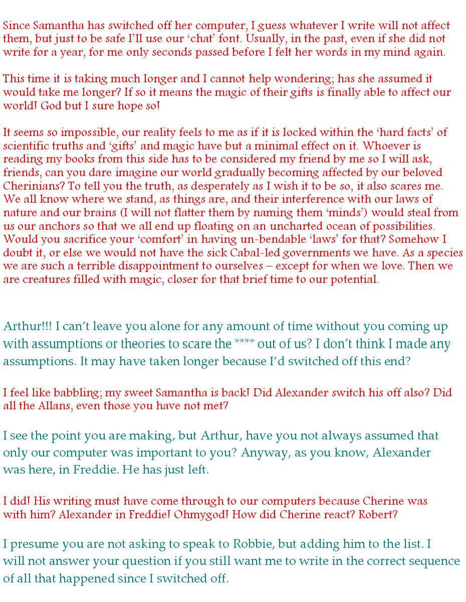 “Samantha, share.” Obediently I entered her mind. I was only too glad to do so since I’d been curious about where she’d gone to and how she’d left - and why the hell Alexander is in Freddie!