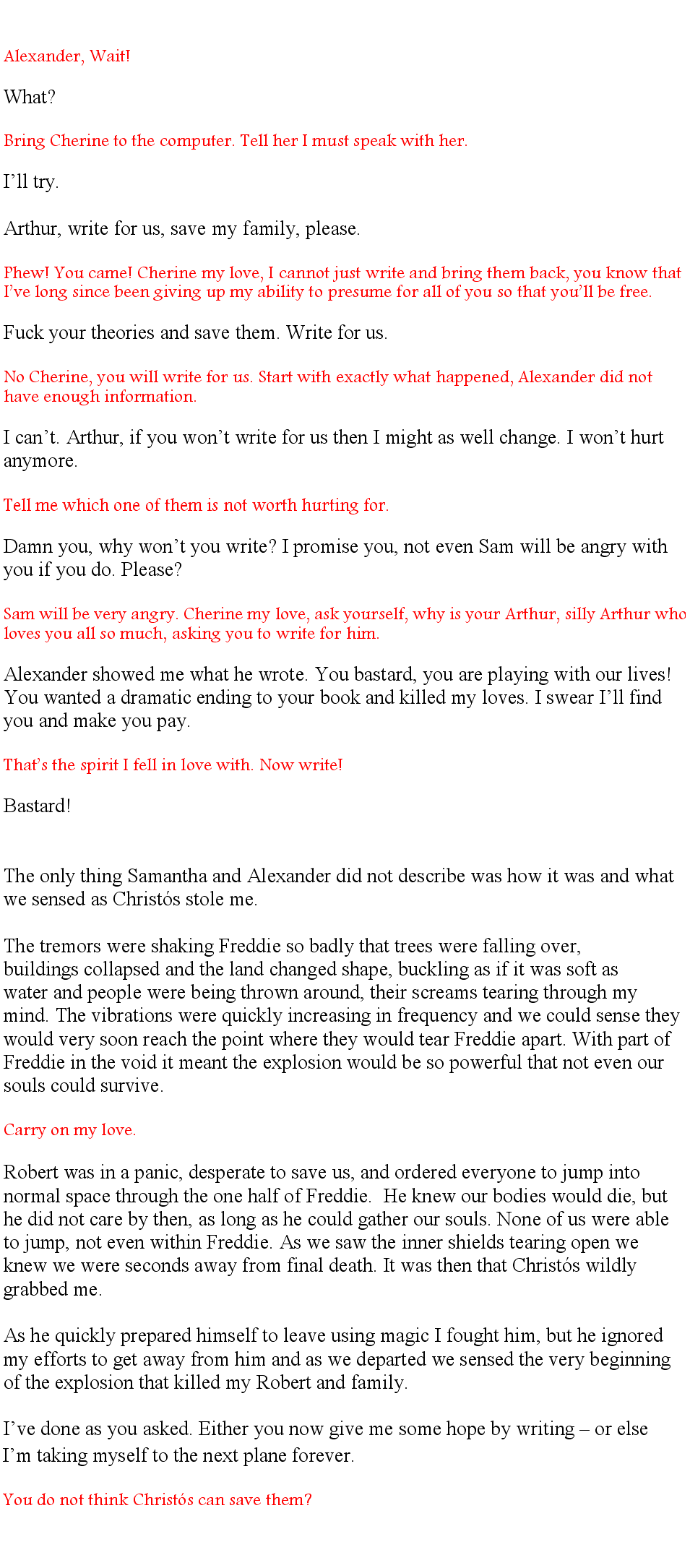 “Oh lord!” I was careful to keep my face serious, but I knew they could sense my urge to laugh. I found this to be such a delicious irony. Christós remained calm and interested, but his alternates were not amused. “You have misunderstood, his action could be construed as the most unselfish of all of us, he was not saving her for himself, but for all of life.”