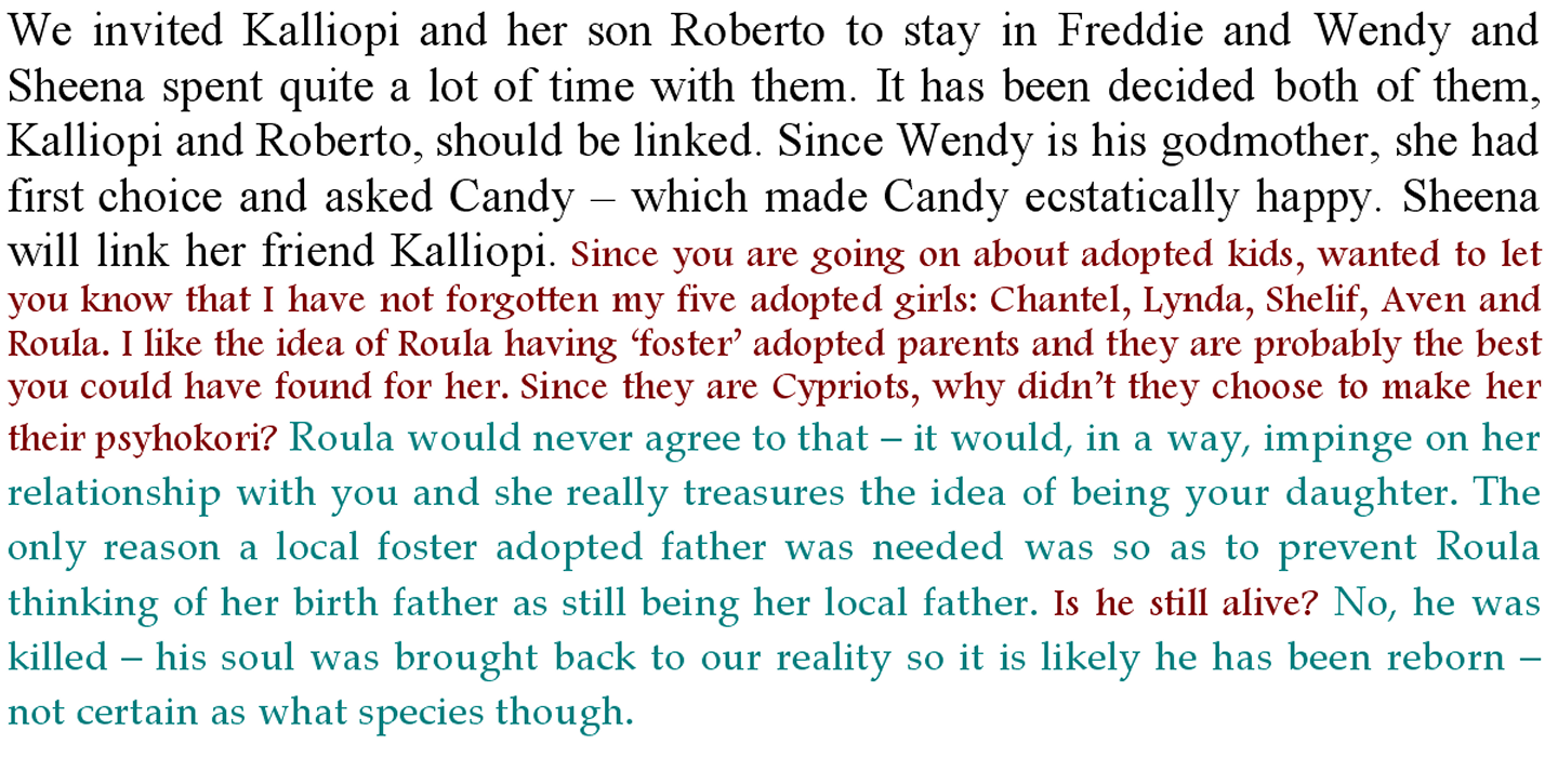 As if things aren’t crazy enough, we had 2,615 Normals ask to be linked - sixteen asked Michael to link them as Ipohin. Campbell had none, but he understands that the experiences have been too intense and he is likely to have some of ours ask to transfer to his group once they’ve calmed down and are frightened by the high standards we expect them to expect of themselves. We only had to refuse one of them, but it saddened us. Assimé asked her to stay in Freddie with us and she is determined to be her ‘special’ friend so as to help her change and be linked. The name of the woman is Trudy and she is American. She is very pretty and Assimé told us, in all earnestness, that it is her beauty that made her unfit for linking. If she was a little girl we might have had to worry about Robbie as she is small (petite), probably is of about a quarter Asian blood, dark-haired, big chocolate brown eyes…as a six year old she would probably have snagged his heart when teardrops sparkled on her eyelashes when she was refused. At first she turned away from Assimé (who often ‘keeps’ herself at the body age of six), withdrawing to her Freddie home. A day later she came back to apologise and agreed to stay if Assimé thinks she should. Agreeing to do so because a ‘six’ year old child asked you to stay and be her friend, I’d say that either she is very calculating or else she has just taken her first step towards being linkable. We better keep an eye on her.