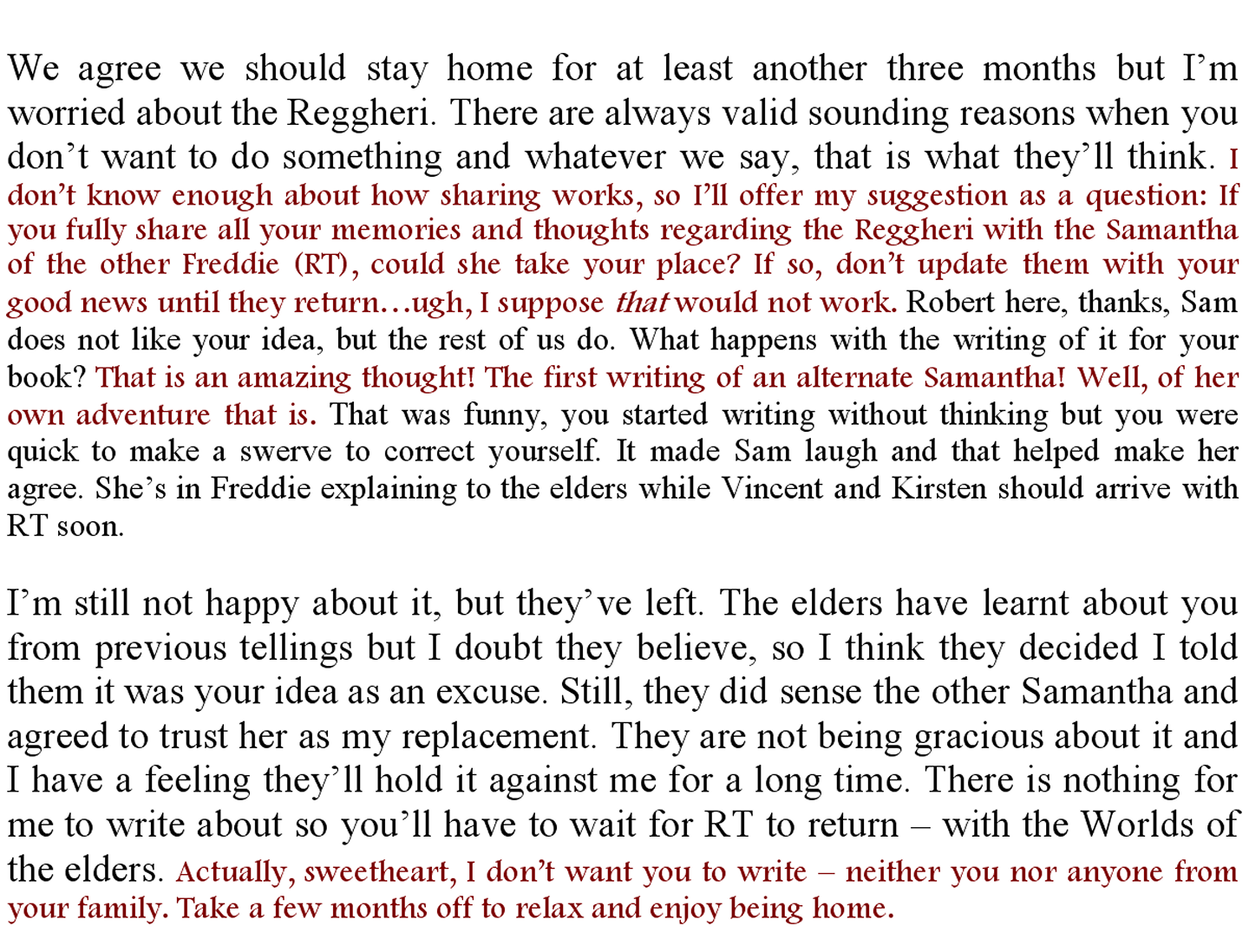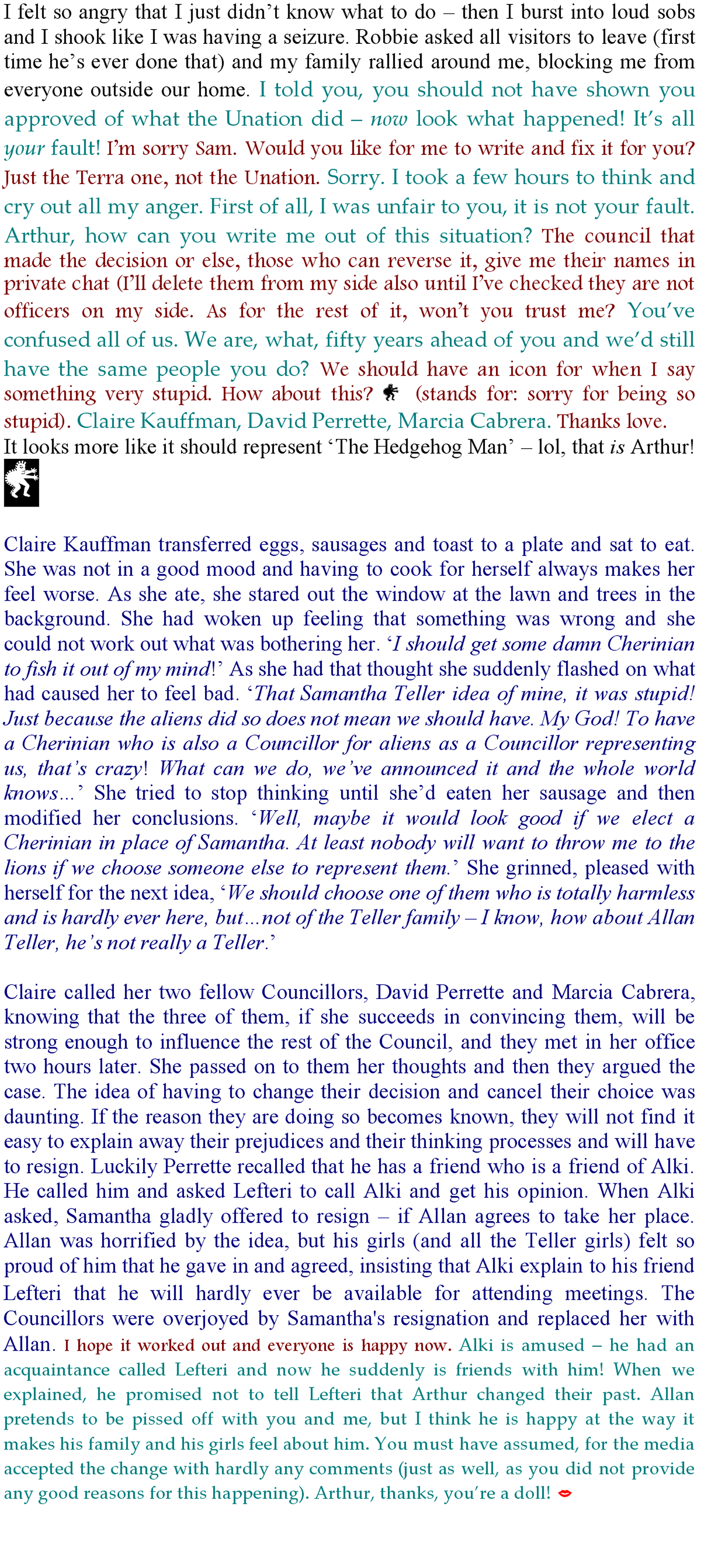 Now that they know they are on the way to implementing their decisions, there is a sense of urgency as they go over all the arguments for and against doing what they agreed with Samantha and Solomon. I’ve taken to sitting close enough to hear them without them feeling I’m there to intrude. Not that they seem to notice my presence, even though they know I’m there. From what I hear, they are not happy about giving up their presence and influence with their people, but they cannot ignore the fact that they are damaging their future. I was pleased to hear Rarlii worry aloud that if they do not go ahead as planned, it is likely their species will be extinct within a dozen generations. The others agreed with him but they cannot seem to rid themselves of their fear of dying.