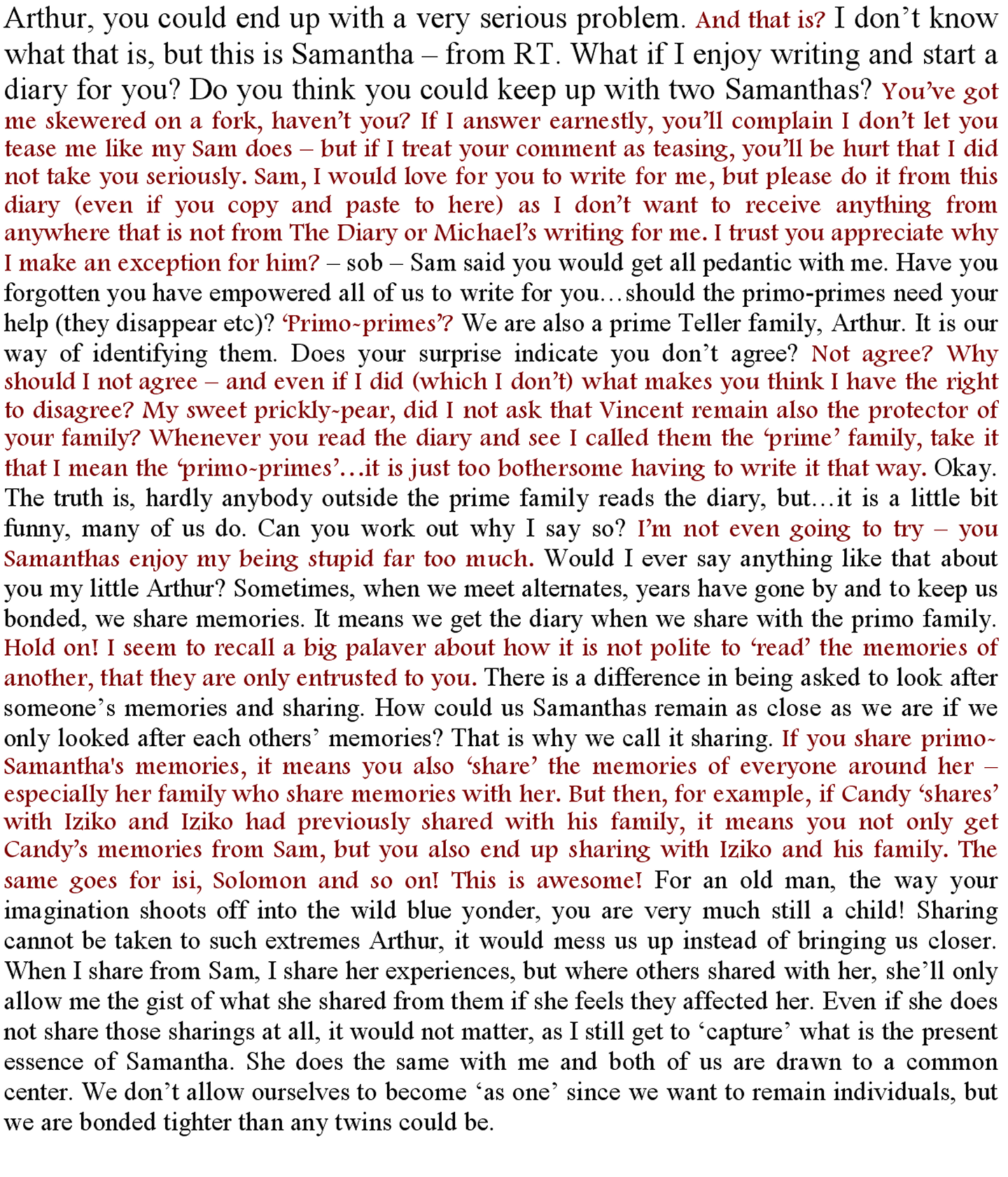 “You have a choice. The Samantha you know does not feel it is right to make you wait so she asked me to take her place. I know exactly what she planned and what you wish to do so it is only a matter of you deciding whether you trust me. If not, I’ll do what I can to make your wait more interesting.”