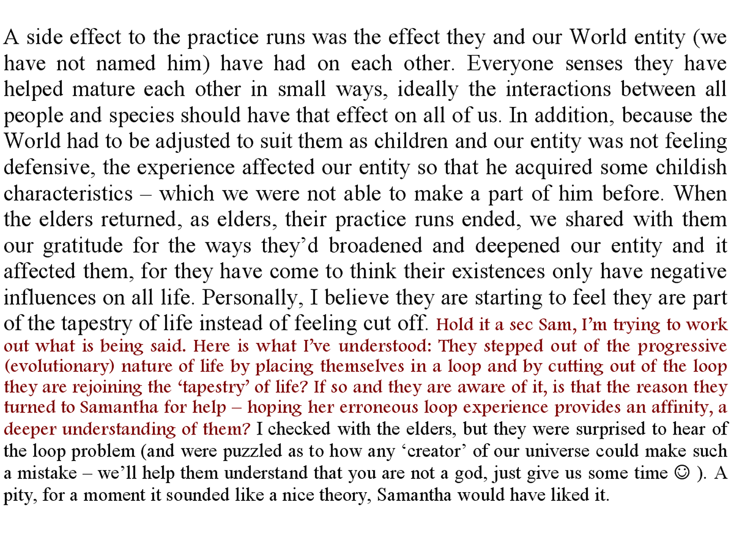 We waited another three days, spending them with the elders and we came to know more of them by name and various friendships flowered. This is the way it should always be, even if it is the harder road to travel. As primo-Samantha likes to think of it, she enjoys the feeling of having a multitude of friends all over the universe and in many realities and claims that the sorrow of leaving friends is more than compensated for by the knowledge that she’ll be seeing them many times during a long life that grows richer with new friends every year.